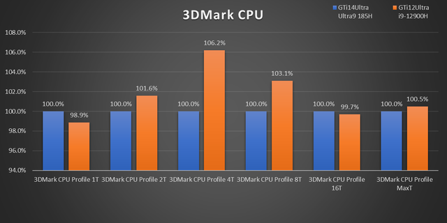 3DMark CPU 测试当中,可以看到由于 Ultra9 185H 小核心更多,在超过12T(6P)以上的场景领先i9-12900H,但是游戏常用的2T~8T中反而是i9-12900H表现会更好一些。