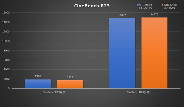 CPU由于是外接显卡使用,这里就先对比二者的 CPU 性能,首先是常见的 CPU 测试软件 CineBench R23,可以看到 i9-12900H 单线程性能落后 Ultra9 185H 约9.8%,不过多核部分得分仅落后0.8%,可以认为处于基本同样的水准。