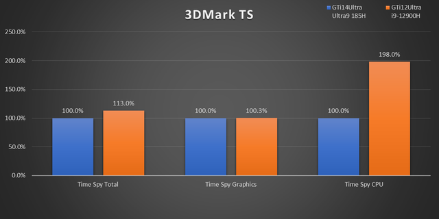 和 PCIe 带宽测试结果类似,零刻 GTi12 Ultra i9-12900H 搭配 RTX4060,在 3DMark TS/FS 中都轻微领先 GTi14 Ultra(U9 185H)。考虑到二者之间售价的差异,价格更加亲民但却同样能使用 EX 多功能显卡扩展坞的 GTi12 Ultra 性价比就很高了。 ▼3DMark TS 图形分差距0.3%