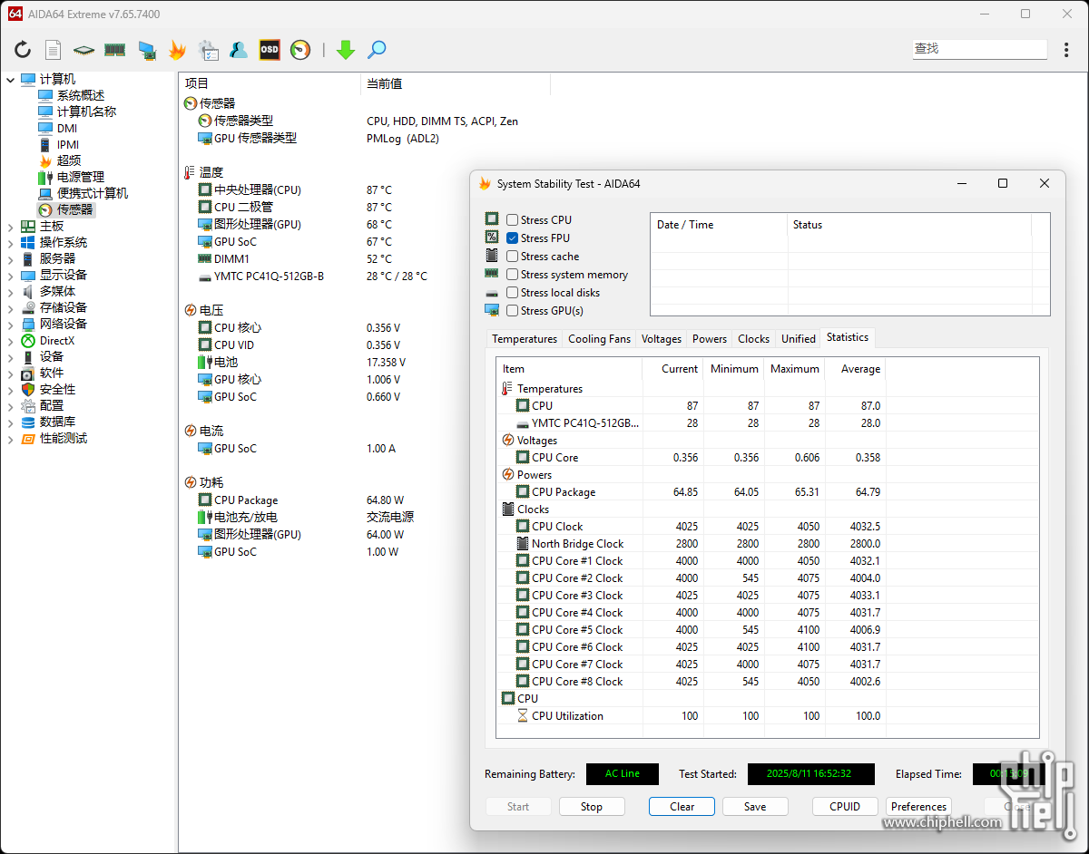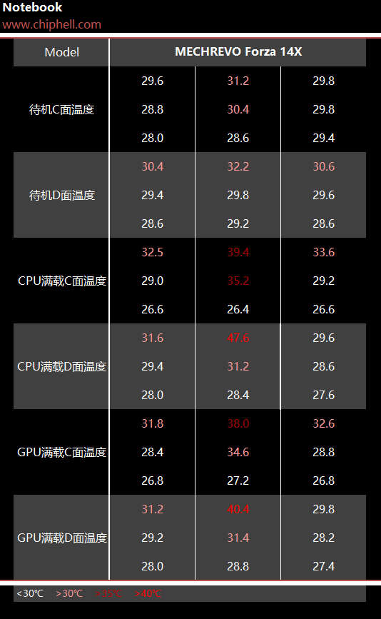 测试在室温22℃ (正负1℃)的环境下进行. CPU的待机温度为41摄氏度左右,GPU为38摄氏度左右. 单烤FPU(AVX2)满载15分钟后温度达到了87摄氏度,温度控制一般.CPU频率为4.0GHz左右,功耗为64.8W左右. GPU满载烤机稳定后温度为61摄氏度左右,频率为2600MHz.烤机时TDP可稳定输出47W左右. 从笔记本C和D面在不同情况下9个点的实测温度来看.C面的键盘和触控板操作区域基本不受到什么影响,温度主要集中在键盘的上部,键盘中部区域体感上只有微微的温热,;D面的温度整体更高一些,但热量同样集中在靠上部的区域,操作区域基本不构成任何影响. 待机时噪音为33.5 dBA. 待机功耗为10.6 W. CPU烤机时噪音为50.7 dBA. CPU烤机功耗为95.9 W. GPU烤机时噪音为43.2dBA. GPU烤机功耗为67.5 W. |