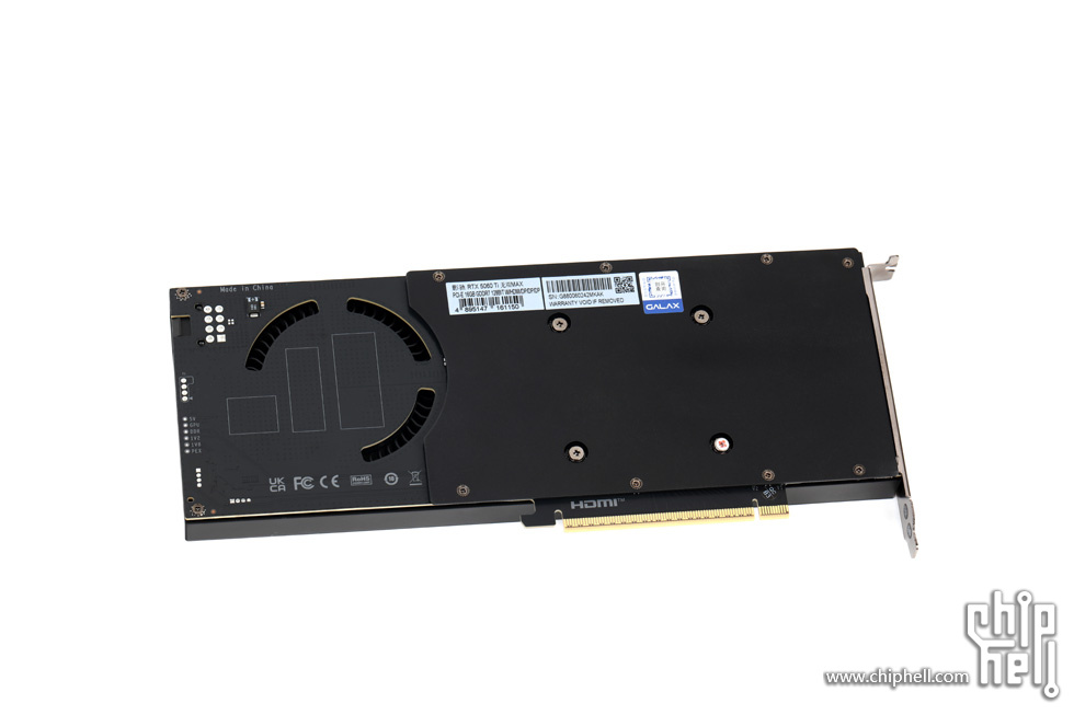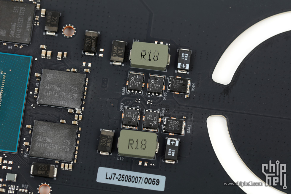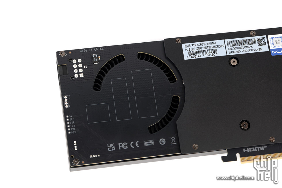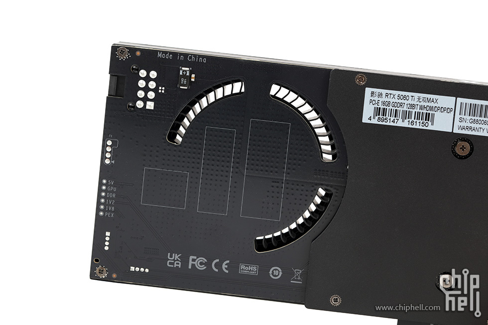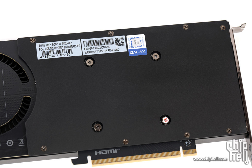 不同于影驰在RTX 50系列上其他款式那夸张无比的大包装盒.在这款以单槽为特色的RTX 5060 Ti无双MAX上则采用了与显卡本身尺寸相匹配的小型包装.不过封面依旧选择以系列的主题图案展示,使其仍有一般零售市场产品包装应有的风貌. 附件仅有一本说明书. 显卡正面.搭配如今早已在主流消费级独立显卡上几乎绝迹了的单槽外排式散热设计.造型上则以纯黑色无装饰的外观风格.边框与面板造型亦未作额外修饰. 显卡背面.为了照顾背部显存散热仍覆盖了背板. 背板同样为无装饰的纯色设计.甚至连一般情况下需要展示的GeForce RTX标识都不见了. 背板的覆盖止于风扇位置.但这并非偷工减料,而是给多卡环境下相邻位置同款显卡的风扇留出更充足的进风空间所作的考量. 黑色的板卡亦针对性开孔以提高进风效率. 输出接口为标准的三个DP2.1与一个HDMI 2.1组合.挡板上开槽以增大散热器的排风空间. 显卡顶部为GeForce RTX标识. 显卡底部. 显卡尾部.封闭式外壳搭配支架固定孔位. 同时8-pin电源接口也置于此处.对机箱深度提出更高要求. 散热片模块依旧为一块矩形开窗,同时表面则以黑化处理抗氧化并提升外观一致性.但与前代不同的是,左半侧的散热片为开放设计,可以使部分热量从此处导出,相比前代提高了散热效率. 同时配合靠近挡板接口位置的开孔共同排风. 单个65mm径流扇. 显卡长度(不含挡板)约267mm,即标准的10.5英寸档位. 高度(含挡板)约125mm. 厚度约20.5mm,控制在单槽范围内. 分解. 散热模块底部.由一体式中框支架与风扇,和均热板底座的铜鳍散热片模块组合. 主散热模块底座采用真空腔均热板,覆盖GPU核心与显存. 真空腔均热板标志性的“小尾巴”收口. 供电MOSFET的散热则由中框部分覆盖. 散热片底部封边且保留铜原色. 截面部分. 继续分解散热器. 主散热片模块正面. 主散热片模块底面. 散热片两侧贴有缓冲垫. 散热片阵列截面. 底部散热片封边仍保持铜原色. 中框内部. 中框底部. 背板内侧.显存颗粒位置贴有导热垫. 板卡正面.适配对应单槽外排散热器的定制型加长非公版板型. 板卡背面. GB206-300-A1 GPU.对应GeForce RTX 5060 Ti. 显存由8片Samsung 16Gb 32bit 28Gbps GDDR7颗粒以双面布局组成16GB 128bit 28Gbps的配置. 8相GPU供电. 每相搭配一颗SiC658A DrMOS(50A) MOSFET. 供电主控AOZ73004CQI. 电源监控芯片NCP45492. 稳压芯片GStek 7155. 2相显存供电. 每相MOSFET配置为2* SM4373NA + SM4377上下桥组合. 显存供电主控为uP1666Q. 尾部仍有影驰显卡标志性的万用表电压测量点. |