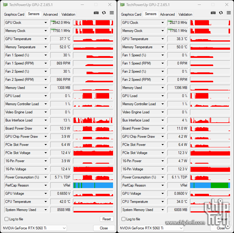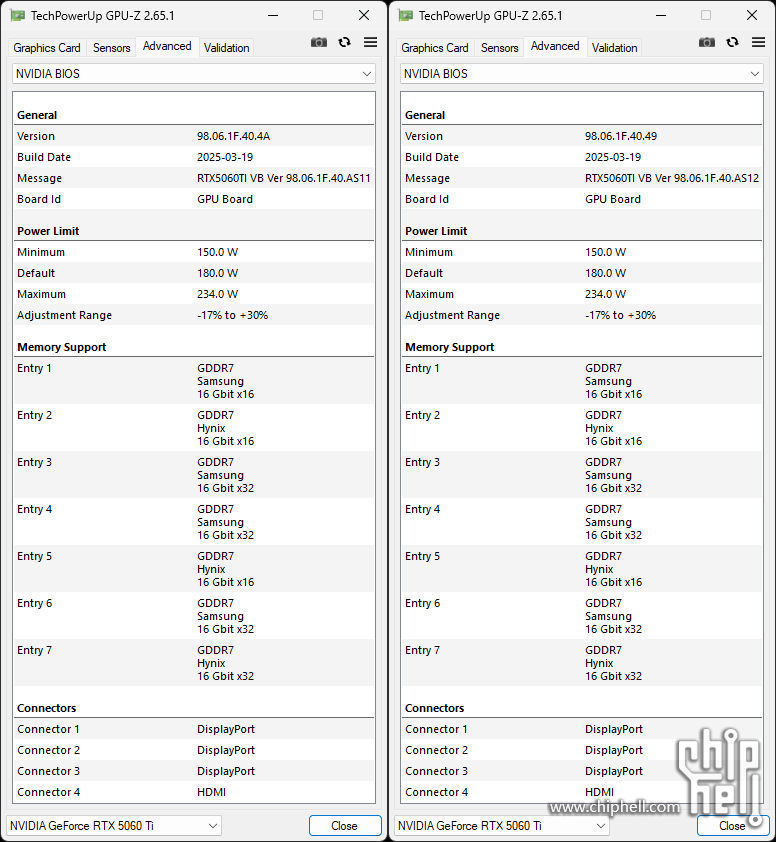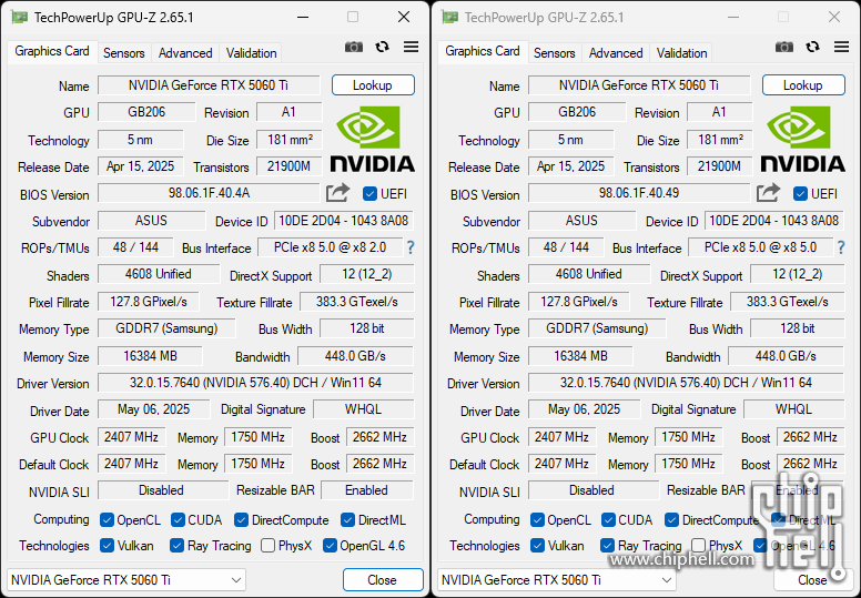 这款TUF-RTX5060TI-O16G-GAMING标称的Boost频率相比公版标准提高到了2662MHz.默认功耗限制维持标准的180W,手动可调上限解锁到234W. 按照ASUS一贯的传统提供了双模式BIOS.分为性能模式(P-mode)和安静模式(Q-mode).两种模式的标称频率和功耗限制设定相同. GPU-Z信息图: (左为P-mode,右为Q-mode) GPU-Z BIOS信息图: (左为P-mode,右为Q-mode) 样卡的两种模式在基础性能测试过程中最大GPU频率达到2847MHz.(P-mode) / 2827MHz(Q-mode) |