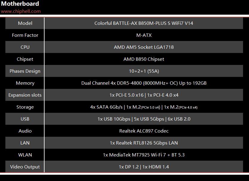 本款Colorful BATTLE-AX B850M-PLUS S WiFi7 V14为M-ATX规格主板,配备四条DDR5内存,原生支持4800MHz,最大可OC至8000MHz+频率.PCIe扩展性上配备一条PCIe 5.0 x16插槽和一条PCIe 4.0 x4插槽.存储方面板载2个M.2 SSD插槽,其中一个支持PCIe 5.0 x4规格,并搭配4个SATA接口.其它外围设备方面,搭载ALC897 Code的板载音频方案以及单5Gbps有线和Wi-Fi 7无线网卡的网络方案,处于目前中等级别主板的主流配置. |
