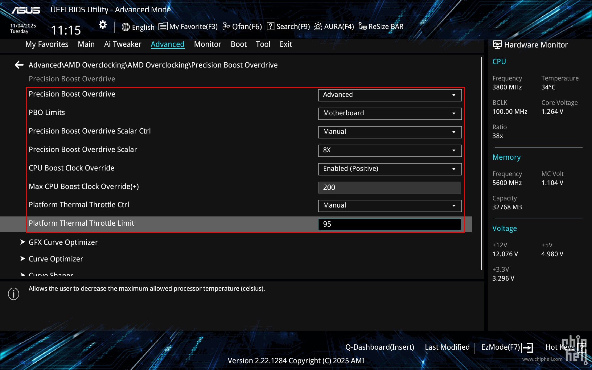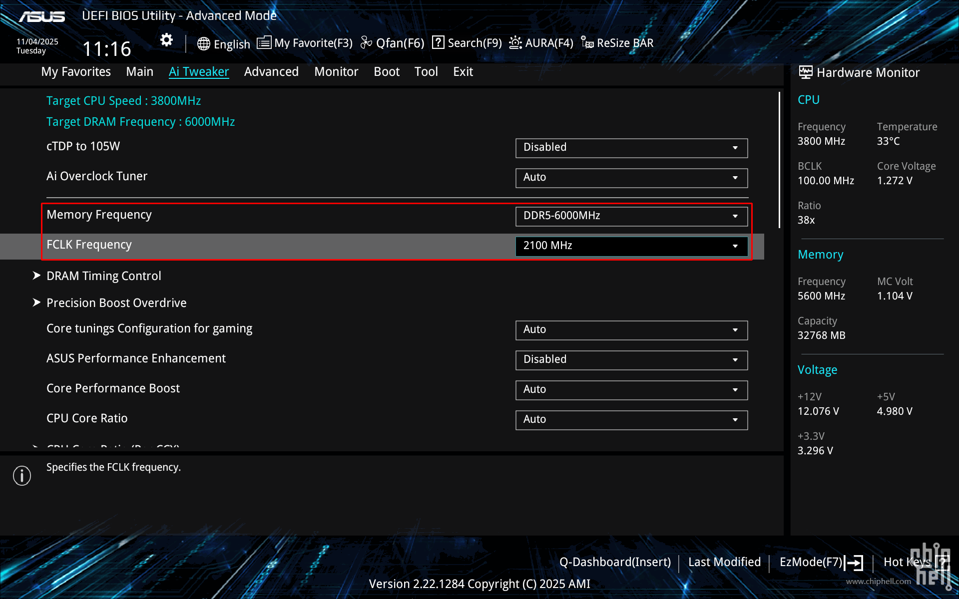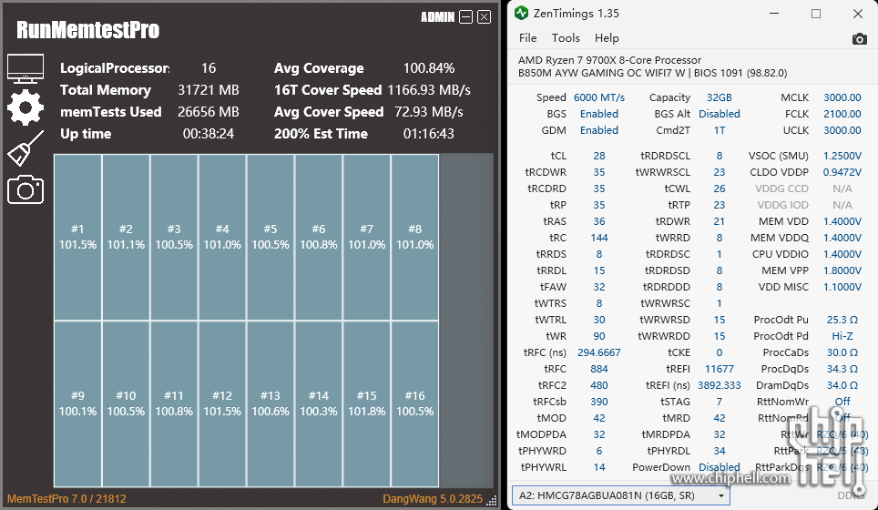 在本次测试中,我们将对Ryzen 7 9800X3D只进行内存超频.而Ryzen 7 9700X分别进行CPU超频,内存超频,打开PBO 105W并对内存超频,CPU和内存同时超频这四种状态下的测试,意在通过对9700X使用不同的性能提升方式,能否追进9800X3D的游戏(Counter-Strike 2)表现. 首先使用Ryzen 7 9800X3D时,CPU保持默认状态,仅对内存进行超频. 默认状态下的CPU-Z基准跑分成绩. 内存超频后的读写延迟成绩. RunMemTest Pro (MemTest Pro 7.0) 100%内存烤机过测截图. 切换到Ryzen 7 9700X的配置下,首先测试默认状态下的CPU-Z基准跑分成绩. 进入BIOS,将‘Precision Boost Overdrive’设置为‘AMD ECO Mode’后,在下方弹出的选项‘AMD ECO Mode’中选择‘cTDP 105W’,即可打开PBO 105W档位. cTDP 105W状态下的CPU-Z基准跑分成绩. 开始手动超频.首先在BIOS内解锁功耗墙,依次进入Advanced\AMD CBS\SMU Common Options,将ECO Mode选为‘Enable – 105W’,将‘PPT Control’选为‘Manual’并将下方‘PPT’设置为‘160000’,即可将功耗墙解锁至160W. 然后设置PBO相关选项,依次进入‘Advanced\AMD Overclocking\Precision Boost Overdrive’,打开PBO‘Advanced’选项后即可修改PBO设置. ‘PBO Limits’设置为‘Motherboard’跟随主板设置.‘PBO Scalar Ctrl’是PBO超频的参数,设置为‘Manual’并将下方‘Sclar’设置为‘8X’,数字越高自动超频幅度越激进.接着下面的‘CPU Boost Clock Override’设置为‘Enabled (Positive)’并将下面的Max数值设为‘200’,意思是CPU频率提升200MHz.最后的‘Platform Thermal Throttle Ctrl’是温度墙控制,设置为‘Manual’并将下面的Limit数值设为‘95’,将温度墙解锁到95℃. 最后给CPU降压,进入‘Curve Optimizer’后将‘Curve Optimizer’依次设置为‘All Cores’, ‘Negative’, ‘30’.这里的意思是全核心负压30.第一次设置可以选择10,这样更保守一些. 使用AIDA 64中的Stress FPU(AVX2)对CPU进行烤机,30分钟无异常. 使用y-cruncher中的VT3测试对CPU进行烤机,25轮无报错. 手动超频状态下的CPU-Z基准跑分成绩. 开始内存超频,依次设置内存频率为6000MHz,FCLK频率为2100MHz. 在内存时序设置中,设置UCLK=MEMCLK,来获取最佳的内存性能.同时将主时序修改为’28-35-35-35-36’. 最后将内存电压设置为1.4V. 内存超频后的读写延迟成绩. RunMemTest Pro (MemTest Pro 7.0) 100%内存烤机过测截图. |
