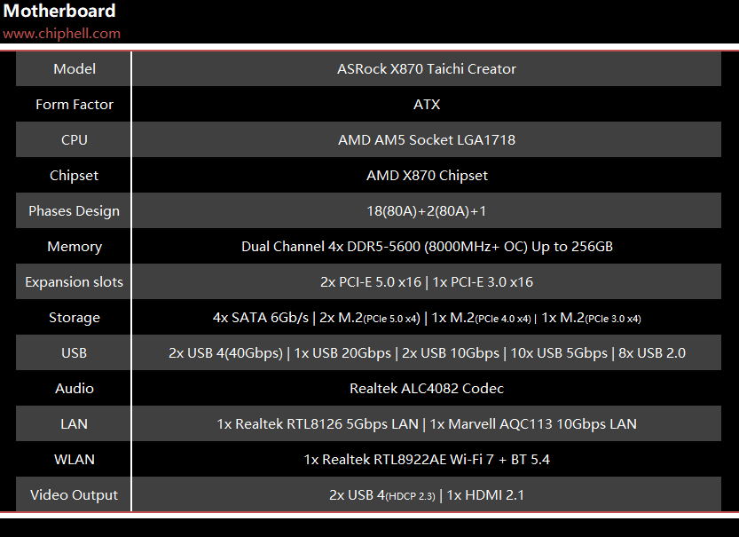本次的ASRock X870 Taichi Creator为ATX规格主板,配备四条DDR5内存插槽,最大容量为256GB,最高频率可OC至8000MHz+.PCIe拓展性上配备两条PCIe 5.0 x16和一条PCIe 3.0 x16插槽.存储方面板载了4个M.2 SSD插槽,其中两个支持PCIe 5.0 x4规格,以及搭配4个SATA接口.其他外围设备方面,音频方案来自ALC4082 Codec,有线网络方面为10Gbps+5Gbps的组合,无线网络为Wi-Fi 7的解决方案.整体规格属于旗舰板中的主流水平. |