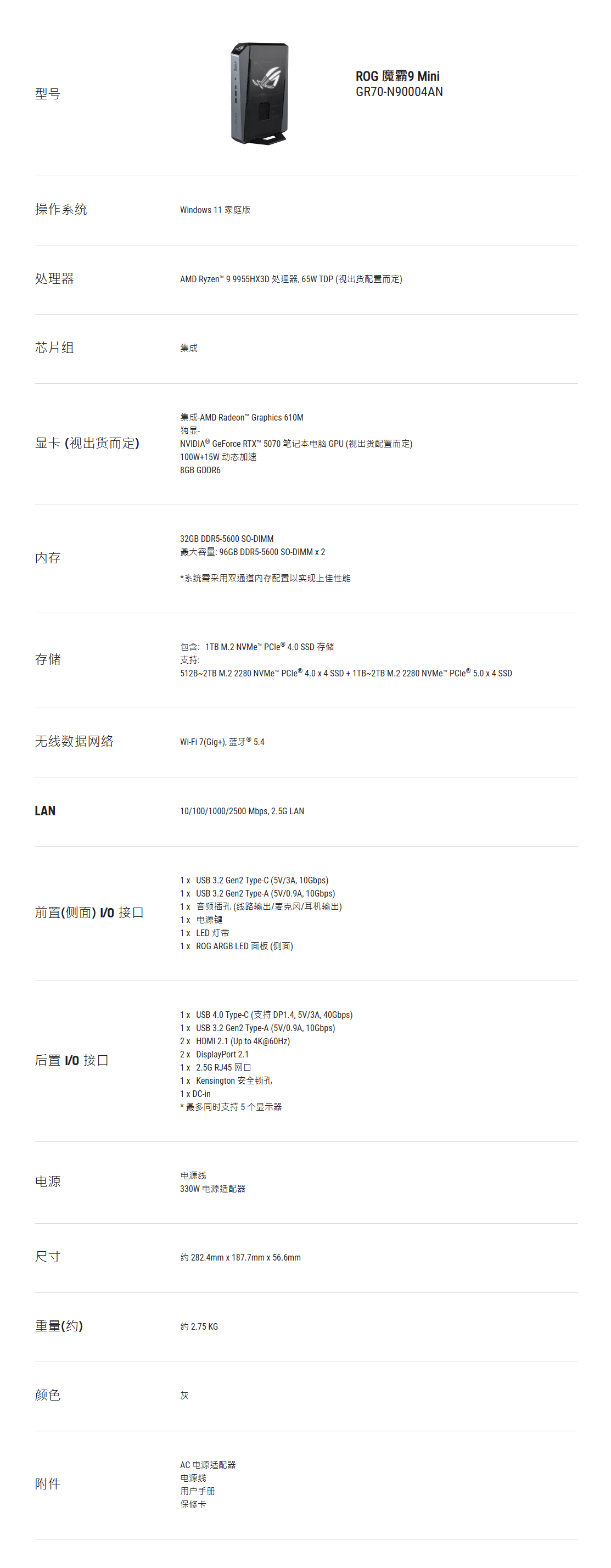 本次收到的ASUS ROG GR70 MiniPC搭载了AMD Ryzen 9 9955HX3D处理器以及NVIDIA RTX 5070 Laptop显卡,内存配置为32GB DDR5 5600MHz,搭配一块1TB的NVMe M.2 SSD存储.其余参数请参考下图. |