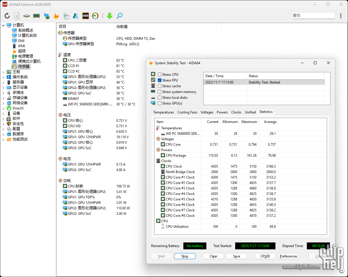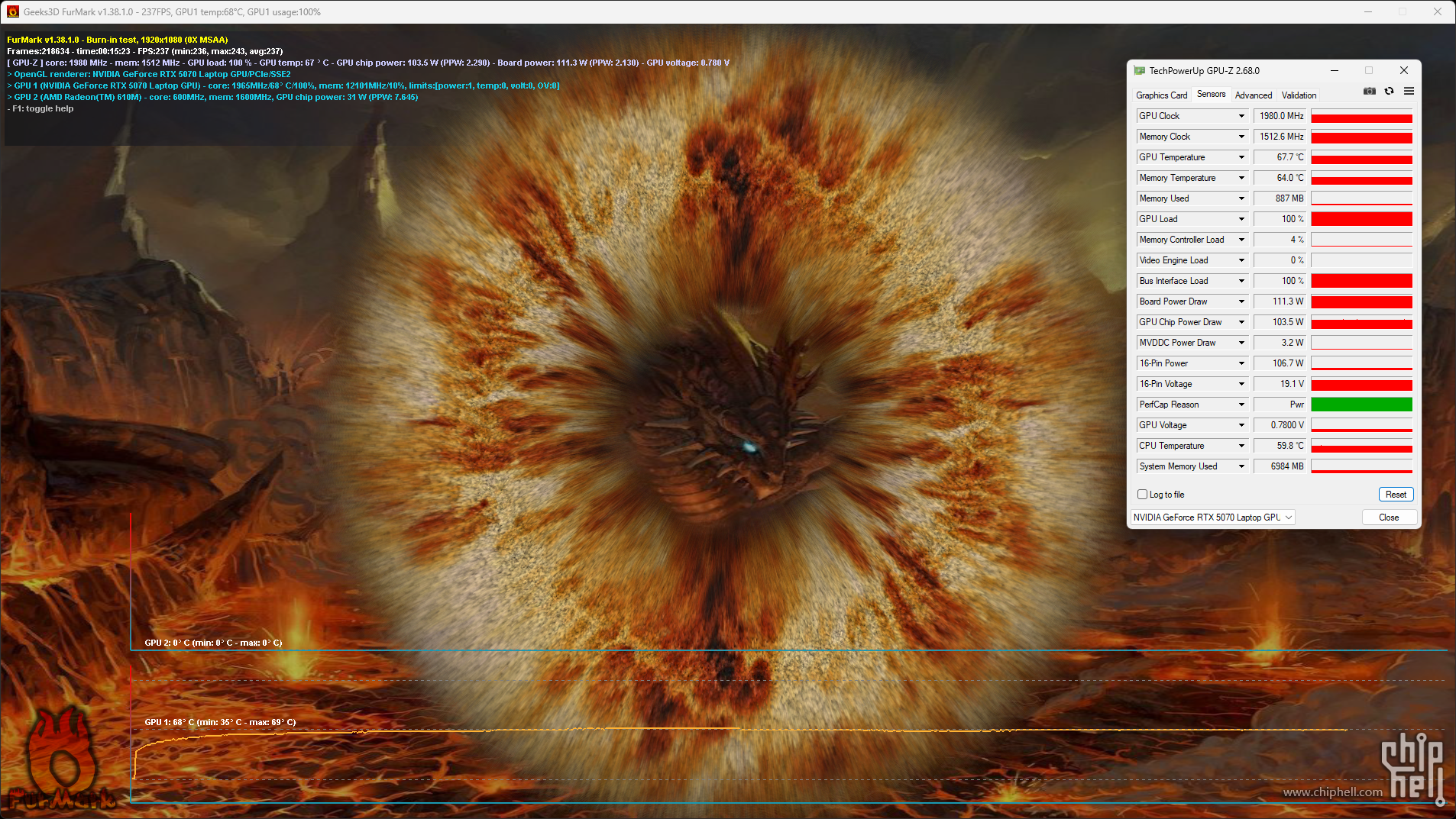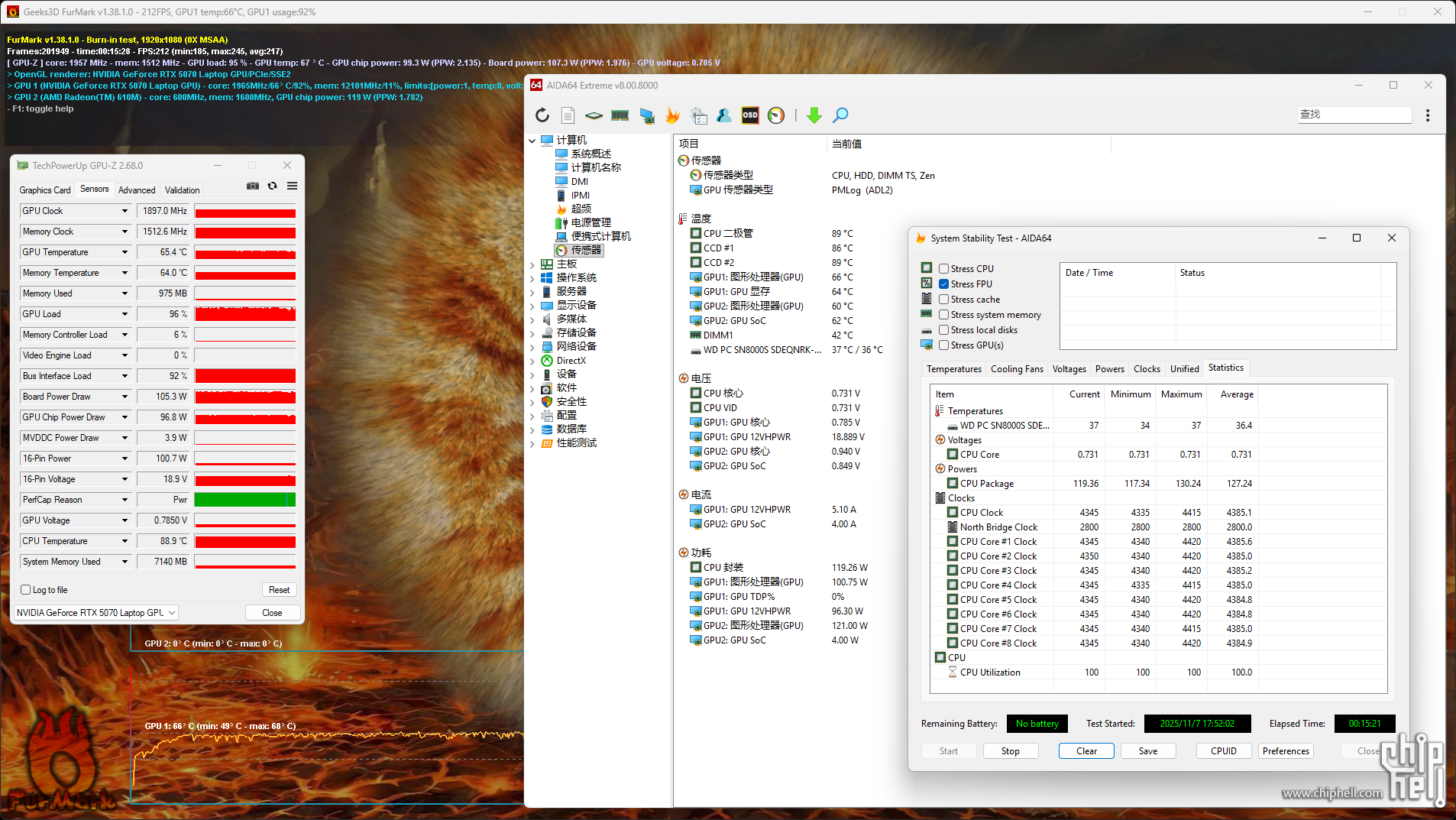 测试在室温22℃ (正负1℃)的环境下进行. CPU的待机温度为32摄氏度左右,GPU为27摄氏度左右. 单烤FPU(AVX2)满载15分钟后温度达到了83摄氏度,温度控制一般.CPU频率维持在为4.31GHz左右,功耗为110W左右. 单烤GPU(Furmark)满载15分钟后温度为67.7摄氏度左右.频率为1980MHz.烤机时TDP可稳定输出111.3W左右功率. 双烤(FPU+Furmark)满载15分钟后,CPU的温度为89摄氏度,频率约为4.34GHz,功耗为119.26W左右.GPU的温度为65.4摄氏度左右,频率为1897MHz,功耗为105.3W左右. 待机时噪音为36.5dBA. 待机功耗为24.5W. CPU烤机时噪音为53.2dBA. CPU烤机功耗为166.7W. GPU烤机时噪音为41.8dBA. GPU烤机功耗为172.3W. 双烤时噪音为53.9dBA. 双烤功耗为293.9W. |