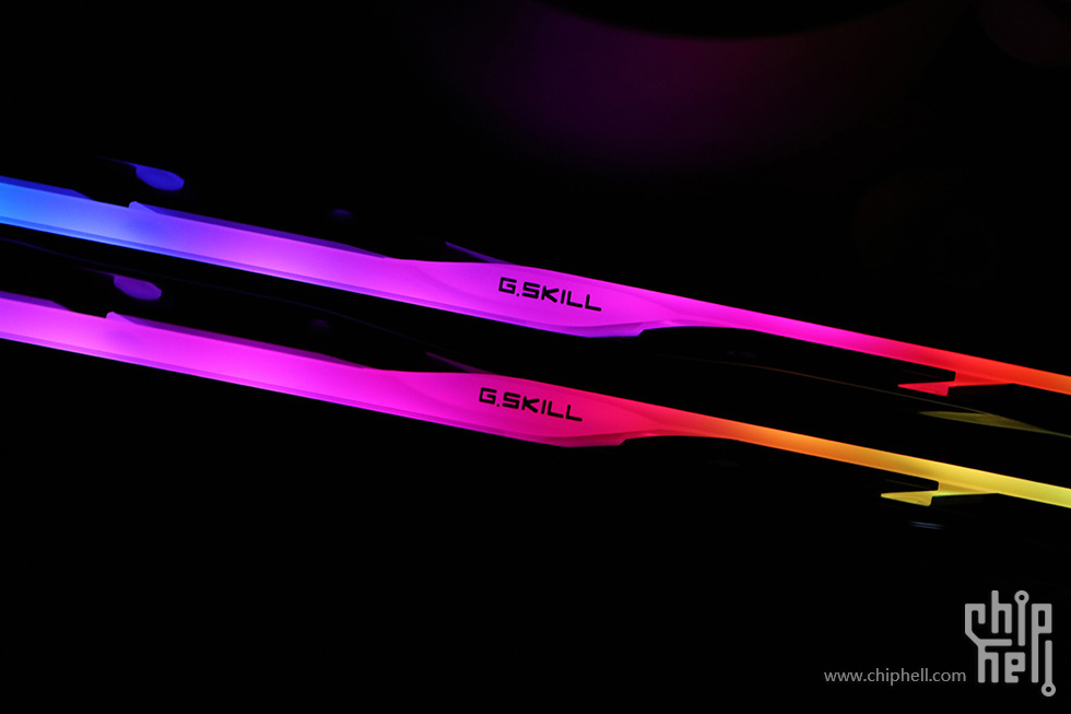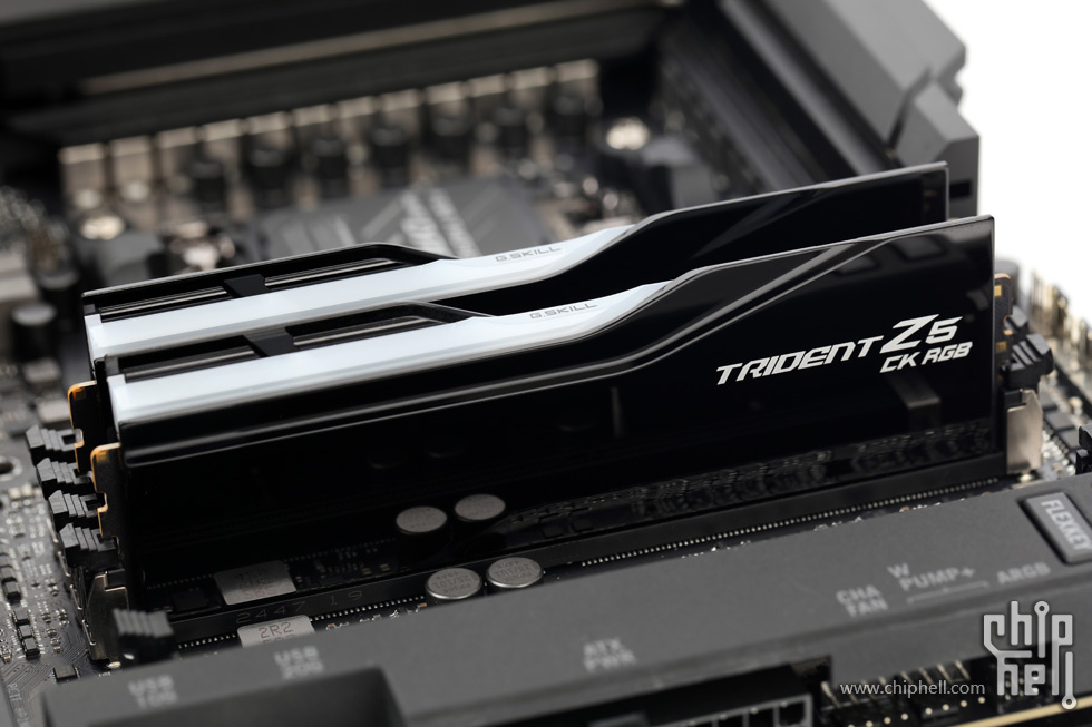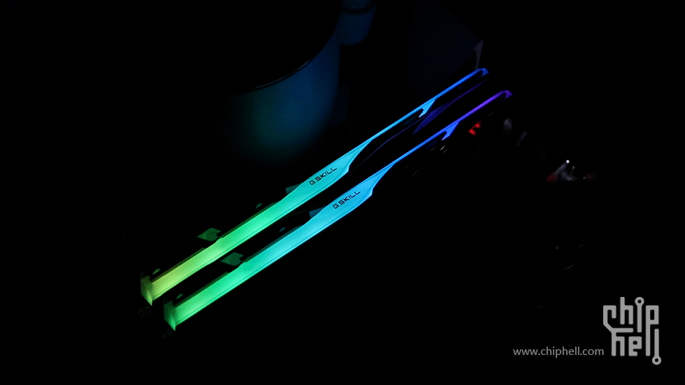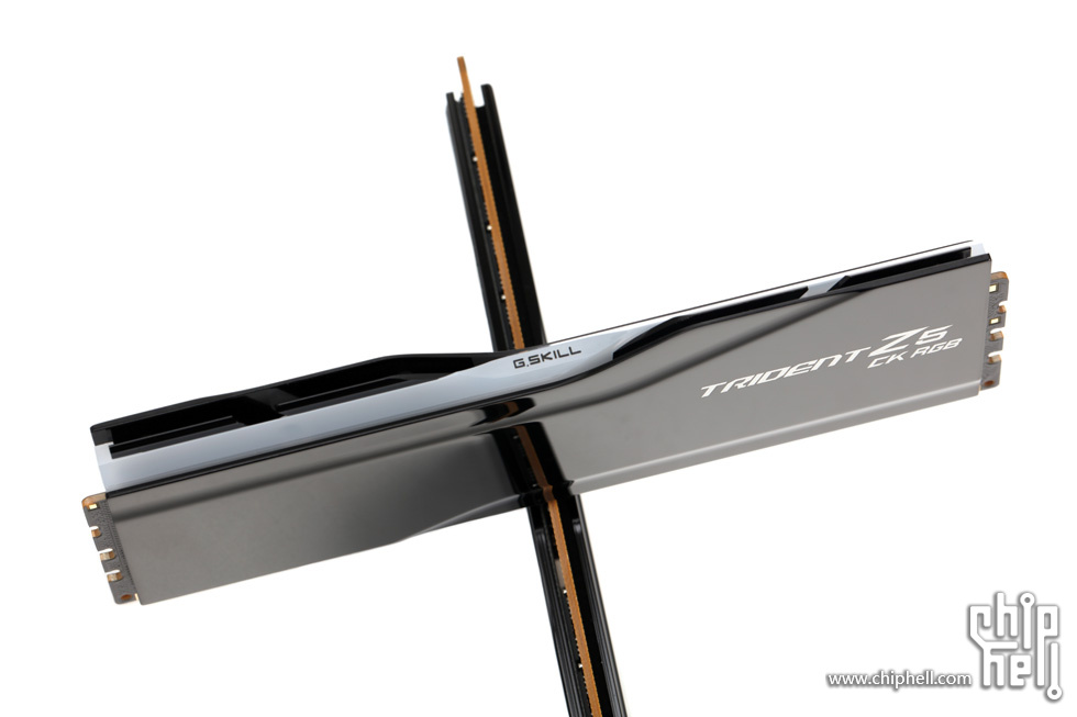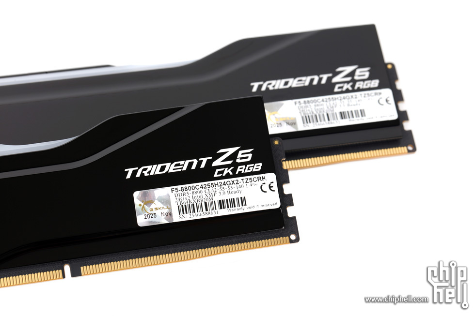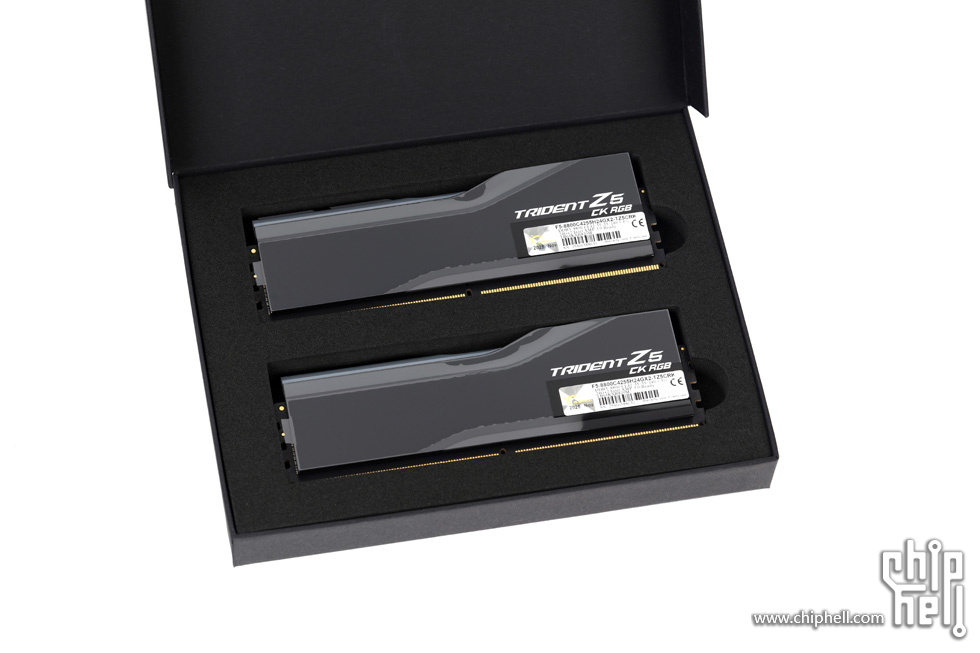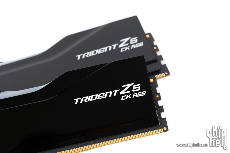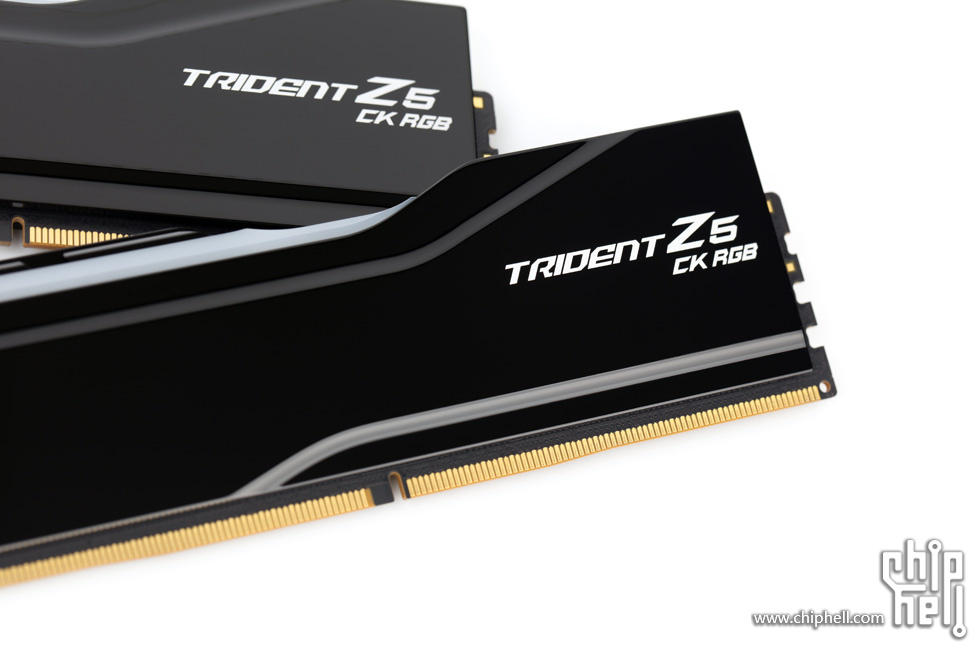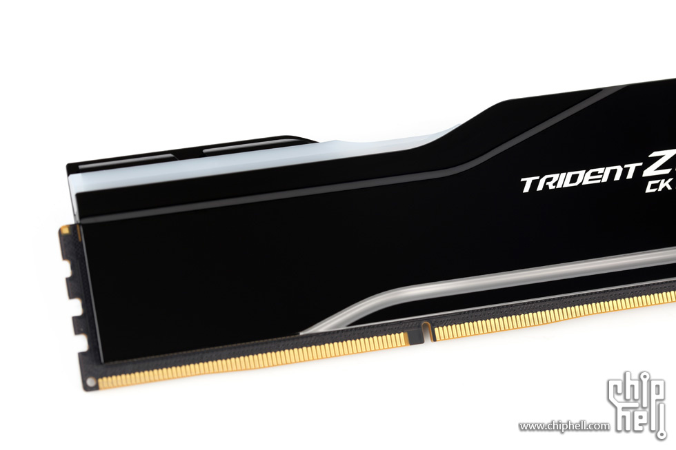 外包装采用黑色礼盒样式,中间绑带印有内存型号,包装右下角贴有“For Intel Z890 Only”标识. 取下绑带后可以看到G.SKILL的LOGO. 包装盒背部,则是印刷了一些产品和公司信息. 位于右下角处的内存的型号标签. 翻开盒盖,可以看到被放置在减震泡棉中的内存. 盒内其余附件,包括1块细绒擦拭布,1张LOGO贴纸,以及1张信息卡片. 取出内存,可以看到内存整体为黑色,表面采用钢琴烤漆工艺. 同时设有上下立体分层式的挖槽设计,使观感更加富有层次. 位于散热马甲右侧的Trident Z5 CK RGB型号字样. 内存背面的设计与正面完全一致. 唯一的区别是背面右侧下部贴有型号标签. 内存顶部依旧是熟悉的斜线对称式RGB灯带设计. 家族式的对称式翻转设计,并在中部交错处印有G.SKILL的LOGO. 半透白的导光条,并延伸至正面区域. 以斜面作为顶部和正面的过渡. 左右两侧都是三层的叠加设计,除了第一层的RGB灯带,后方的开槽鳍片式设计除了装饰也有助于增加散热面积和气流通过. 内存底部视角,可以看到为单面颗粒设计. 内存高约为43mm. 上机后距主板PCB约44mm. 上机图赏. 默认RGB动态灯效. 静态灯光细节. |