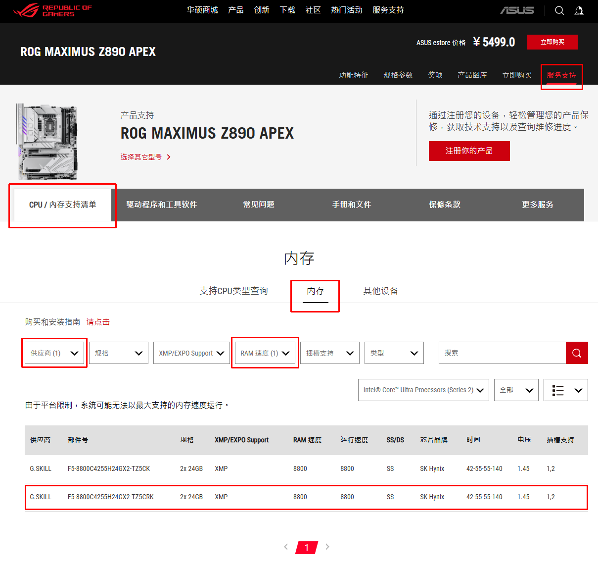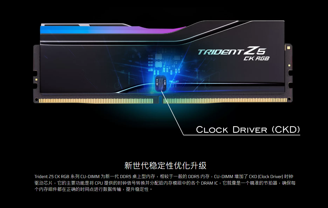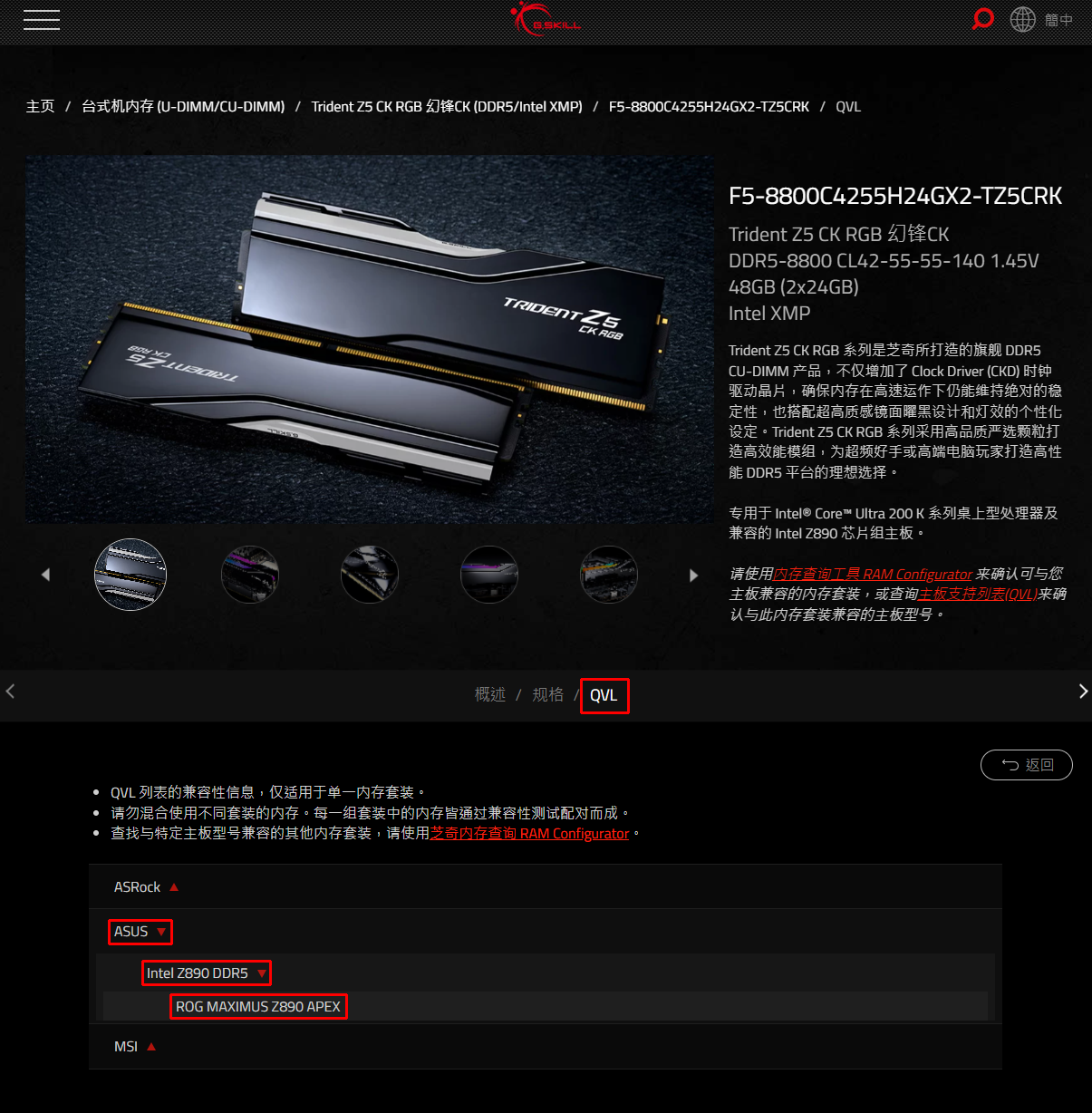 本次测试的为CU-DIMM内存,根据芝奇官网的介绍可知,相比普通的DDR5内存,CU-DIMM内存增加了一个CKD时钟驱动芯片,可以更好的将CPU时钟信号传递至内存模组中的各个DRAM中,以此来提升内存稳定性. 由于本套内存DDR5-8800的超高频率,需要翻阅QVL兼容性列表来查看主板与内存之间的兼容性.在主板或内存官方网站上均可以查阅. 以本次测试的ROG主板为例,在ROG官方网站找到对应型号的主板页面,依次选择服务支持-CPU/内存支持清单-内存,然后在供应商内选择G.SKILL,在RAM速度内选择8800,即可看到本次测试的内存型号,证明这套内存和主板是相互兼容且可以使用的. 同时通过内存官方网站中也可以找到QVL兼容性列表.在G.SKILL官方网站中找到对应型号的内存页面,选择QVL,然后依次选择ASUS-Intel Z890 DDR5后,即可看到本次测试的主板型号,证明这套内存和主板是相互兼容且可以使用的. |