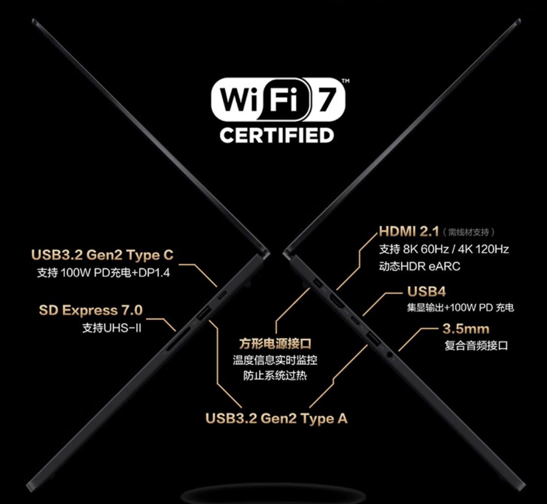 高速数据传输:机身左侧配备了一个万能的USB4接口(兼容雷电4协议),提供高达40Gbps的数据传输速度,支持100W PD快充,可用于连接高速固态硬盘与扩展坞。同时,还提供了一个USB 3.2 Gen 2 Type-A接口,方便连接传统外设。标准的HDMI 2.1接口,可轻松输出至高规格显示器与投影仪,方便外放展示内容。