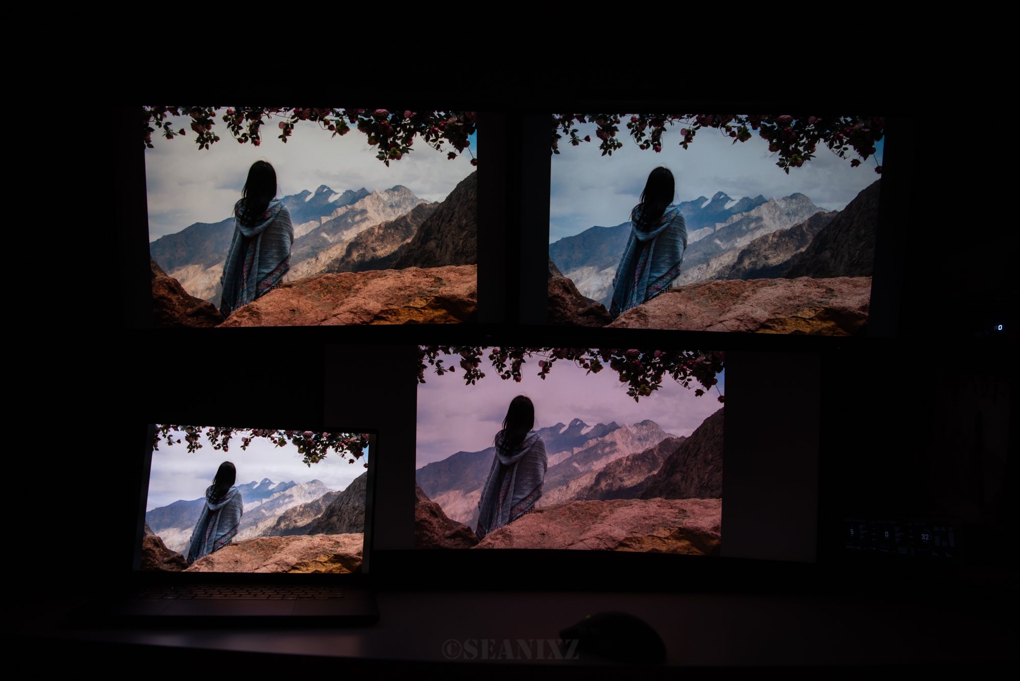 实拍对比: (左下角为华硕ProArt 创16 2025屏幕展示,其他为显示器展示)