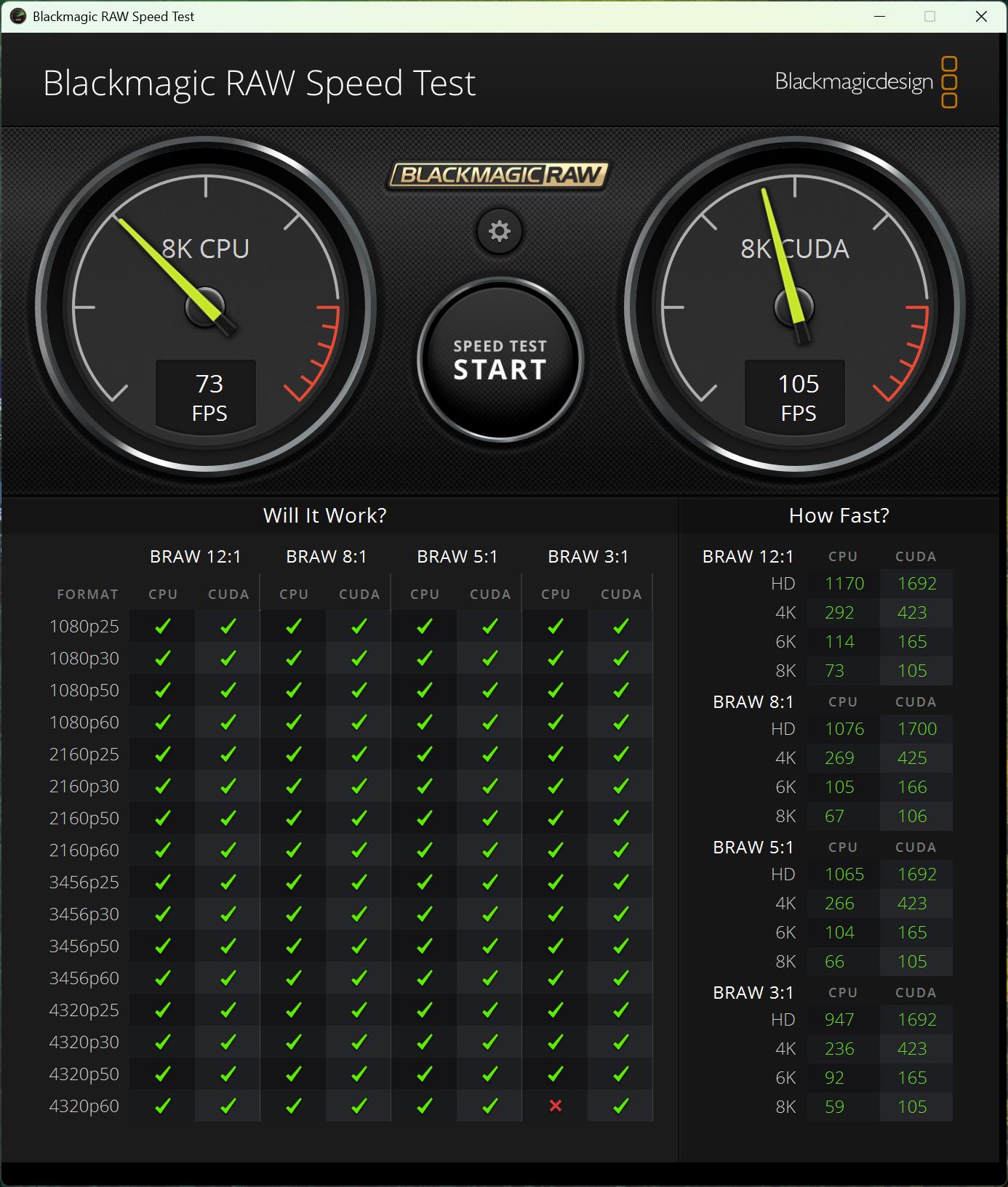 达芬奇自带的Blackmagic RAW Speed Test显示,华硕ProArt 创16 2025 的RTX 5090 24GB这个配置已经可以流畅渲染8K60P的RAW格式原片了,所有项满满的√意味着它其实已经完全满足这个时代甚至未来3-5年以上的超高规格影视级视频创作需求了,用做创作本属实绰绰有余了。