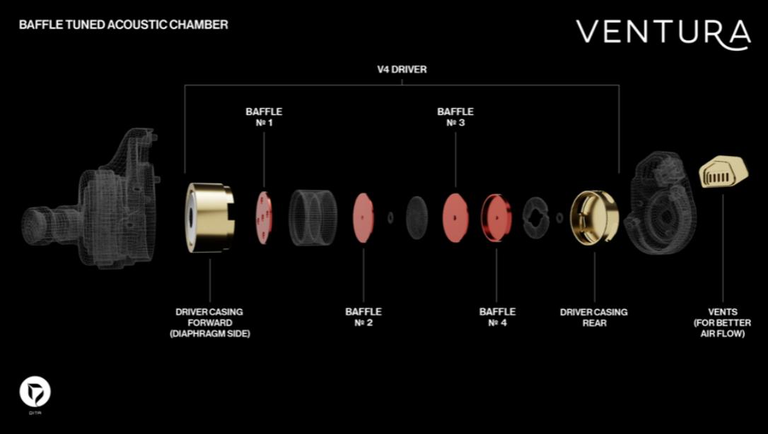Ventura搭载一颗新鲜出炉的,口径为12mm的全自研单动圈单元,名为V4 QUAD BAFFLE。