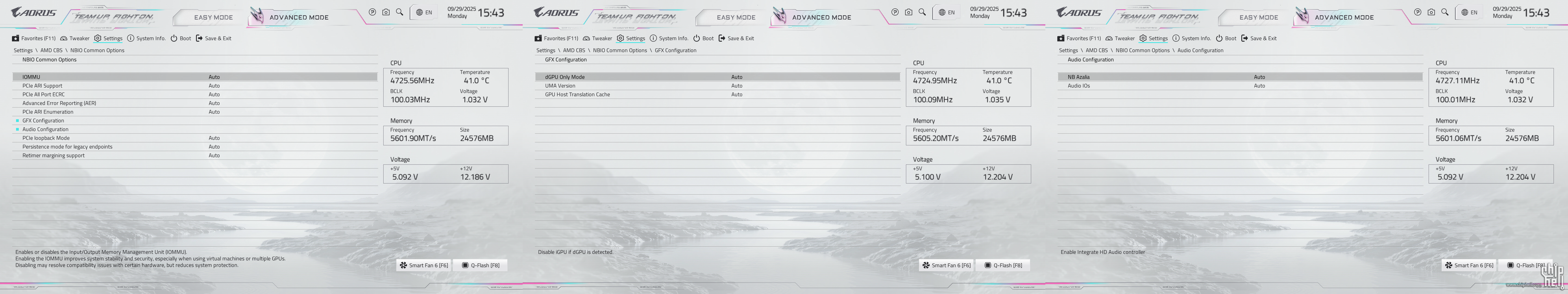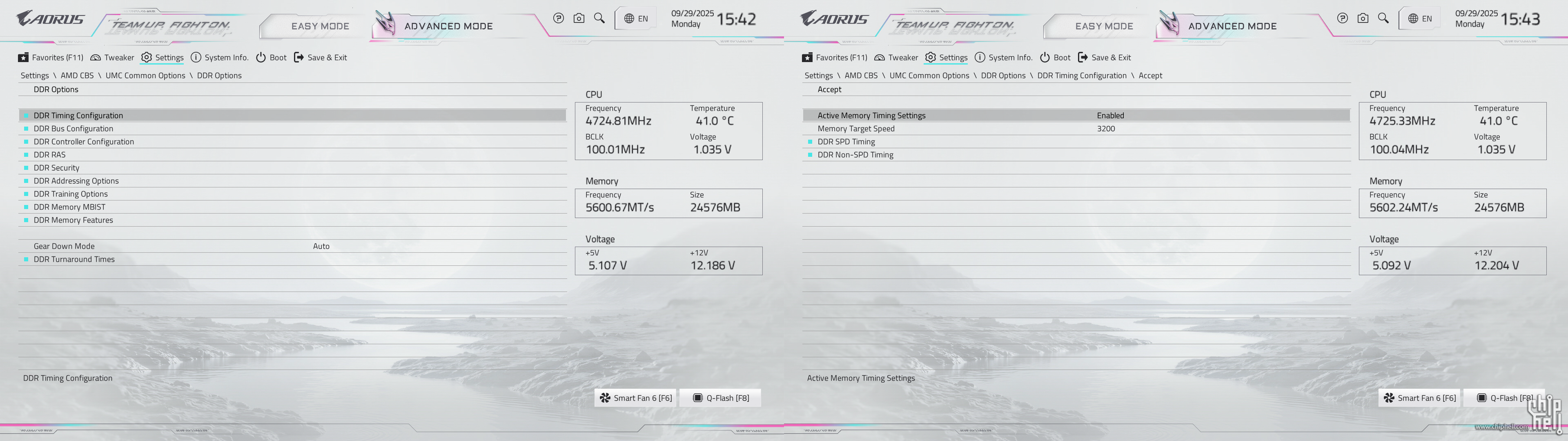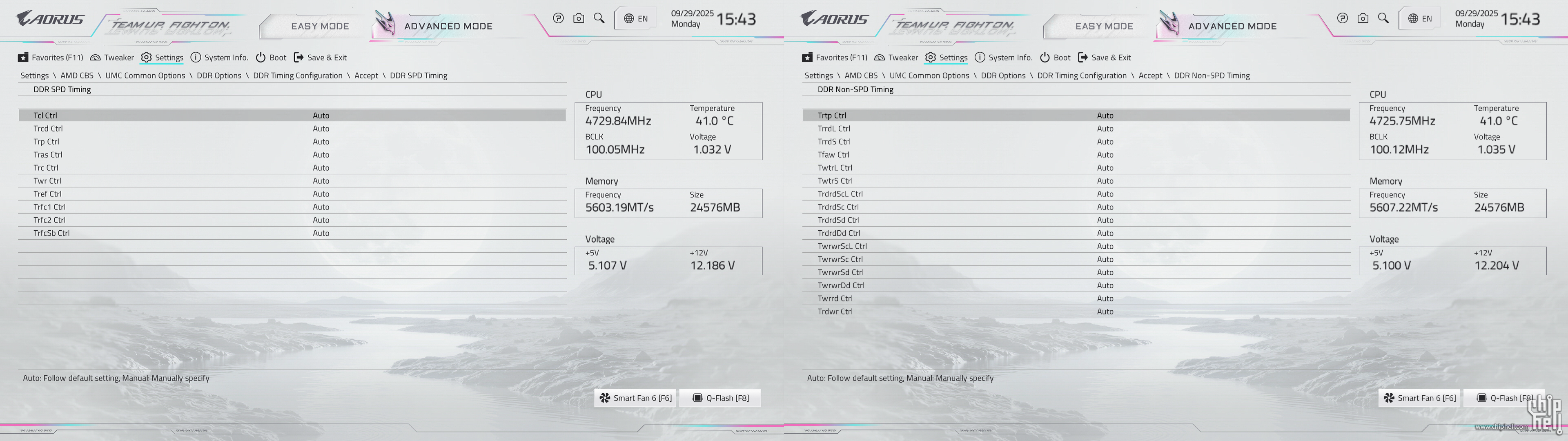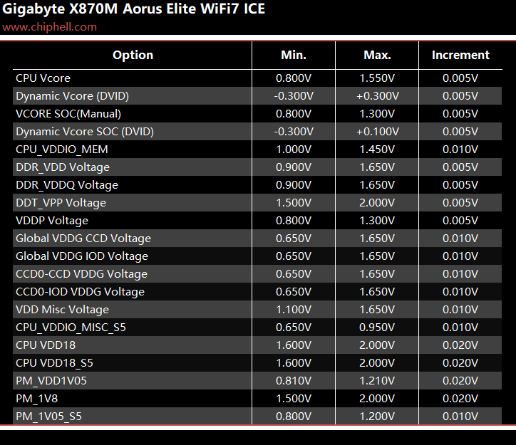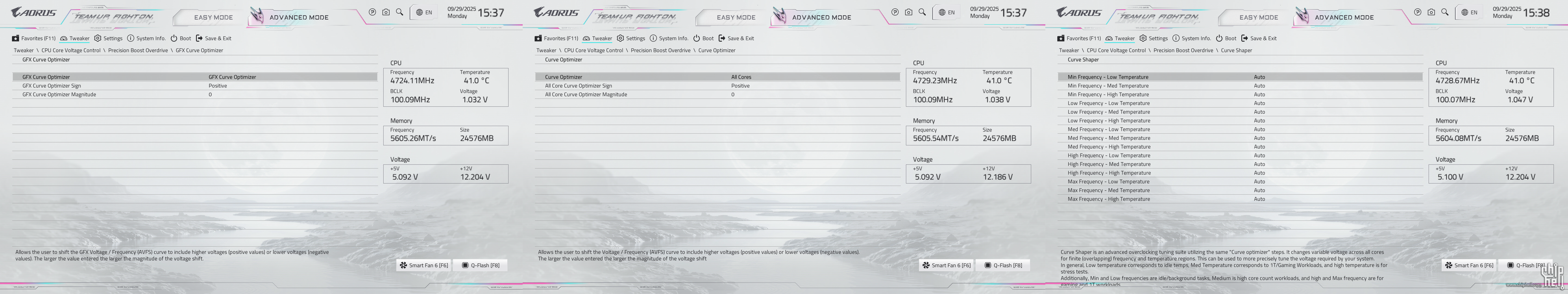全新设计的界面布局,维持技嘉一贯的扁平排布风格,并使用白色为主题色. 进入BIOS后默认为简易模式,可查阅一些基本信息,并可快速调节一些例如XMP/EXPO开启,Smart Fan风扇调整,X3D Turbo Mode功能,Q-Flash更新BIOS,内存SPD信息和配置等. Smart Fan风扇调整提供了图形化的界面,可供用户更加方便的进行自定义. Q-Flash和内存配置相关页面. 按下F2切换至高级模式,默认切换到Favorites主菜单,可以收藏选项来方便快速进入. Tweaker主菜单,提供了各种与性能相关的调节选项.包括CPU频率,内存频率以及对应的电压和功耗等条目. PBO选项,提供手动模式,可使得高阶用户可以进行更加精细的手动调节. Curve Optimizer电压曲线优化设定,通过调节PBO电压对应的频率曲线,可以实现降压超频. 内存XMP/EXPO配置文件一键载入,并设有对应调节的选项. 电压控制子菜单,如CPU核心和PM,Misc等电压数值的调节. 主板提供可调节的电压条目,模式,数值: CPU防掉压设置,设有Auto/Normal/Standard/Low/Medium/High/Turbo/Extreme总计8个调节选项. Settings主菜单,包含电源选项,I/O接口,AMD CBS设置,AMD超频选项以及电脑状态. 进入AMD CBS设置. 内存时序控制,提供了比较详细的时序参数可供调节. CPU通用选项,可以对核显和音频进行调整. System Info主菜单,可以看到当前主板的状态. Boot主菜单,可以修改启动选项. |