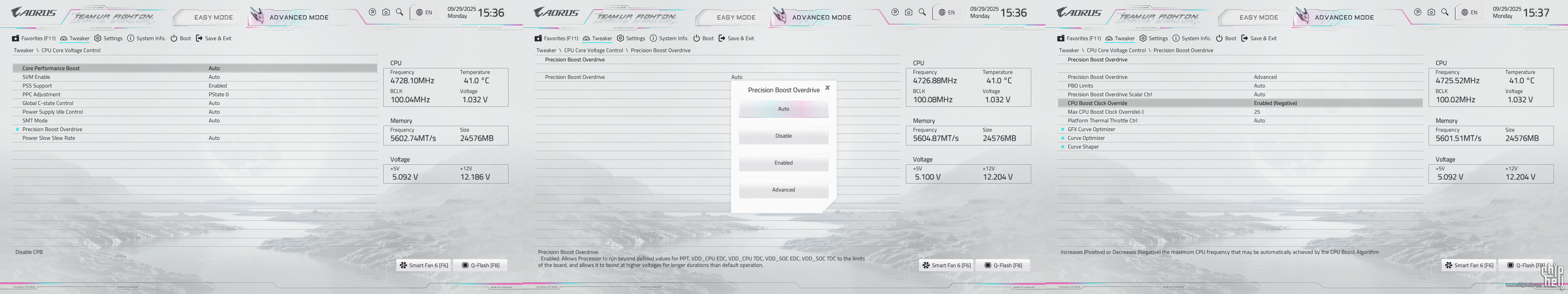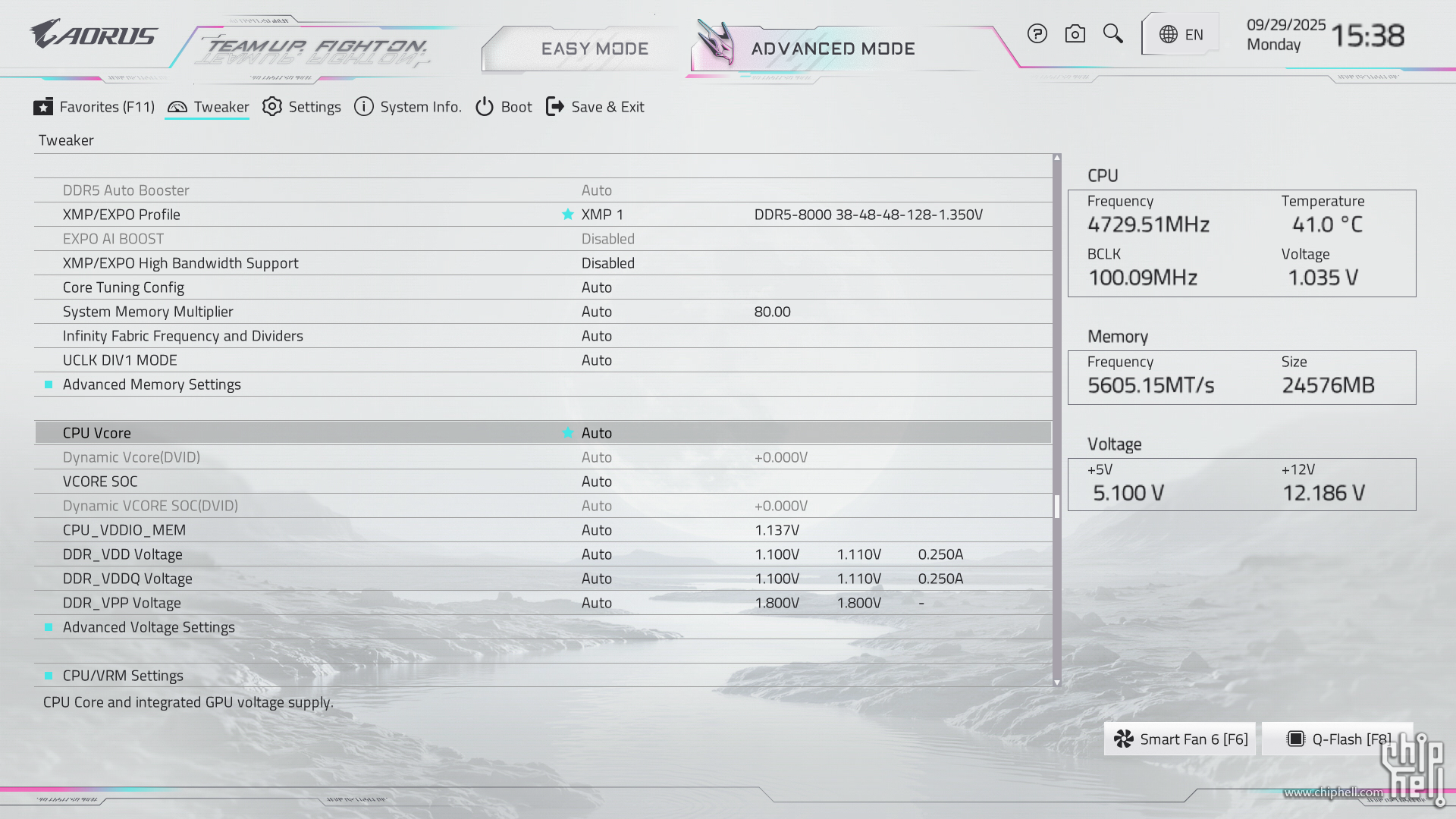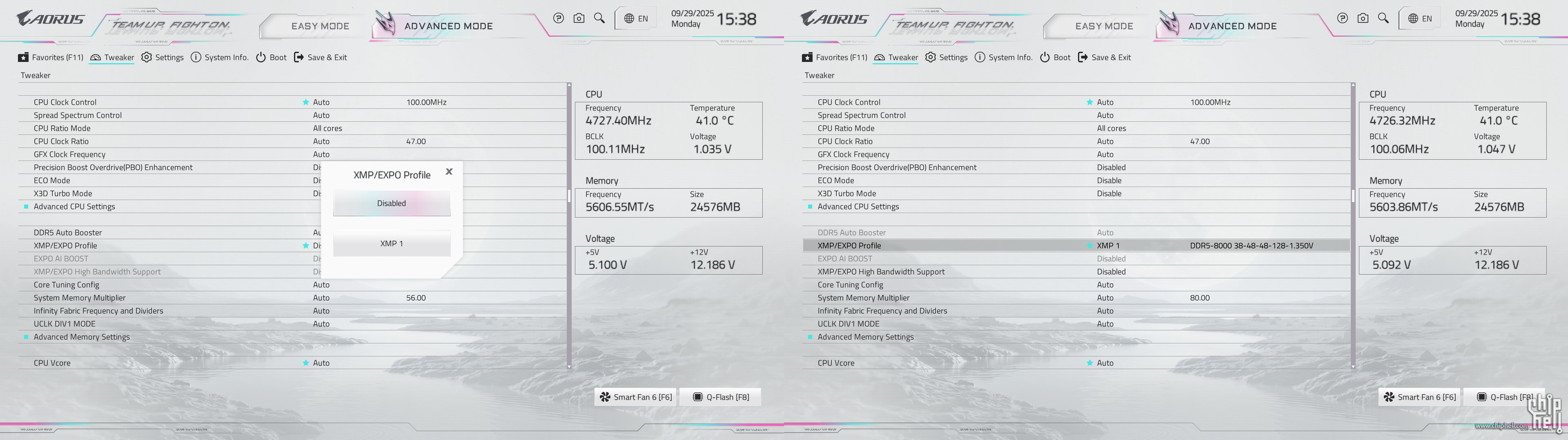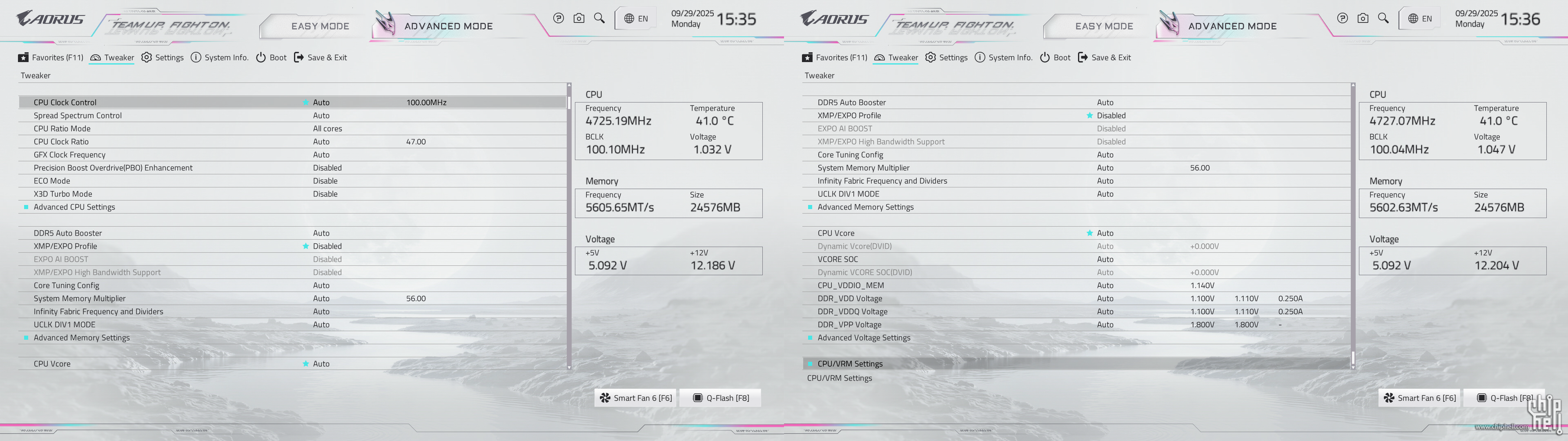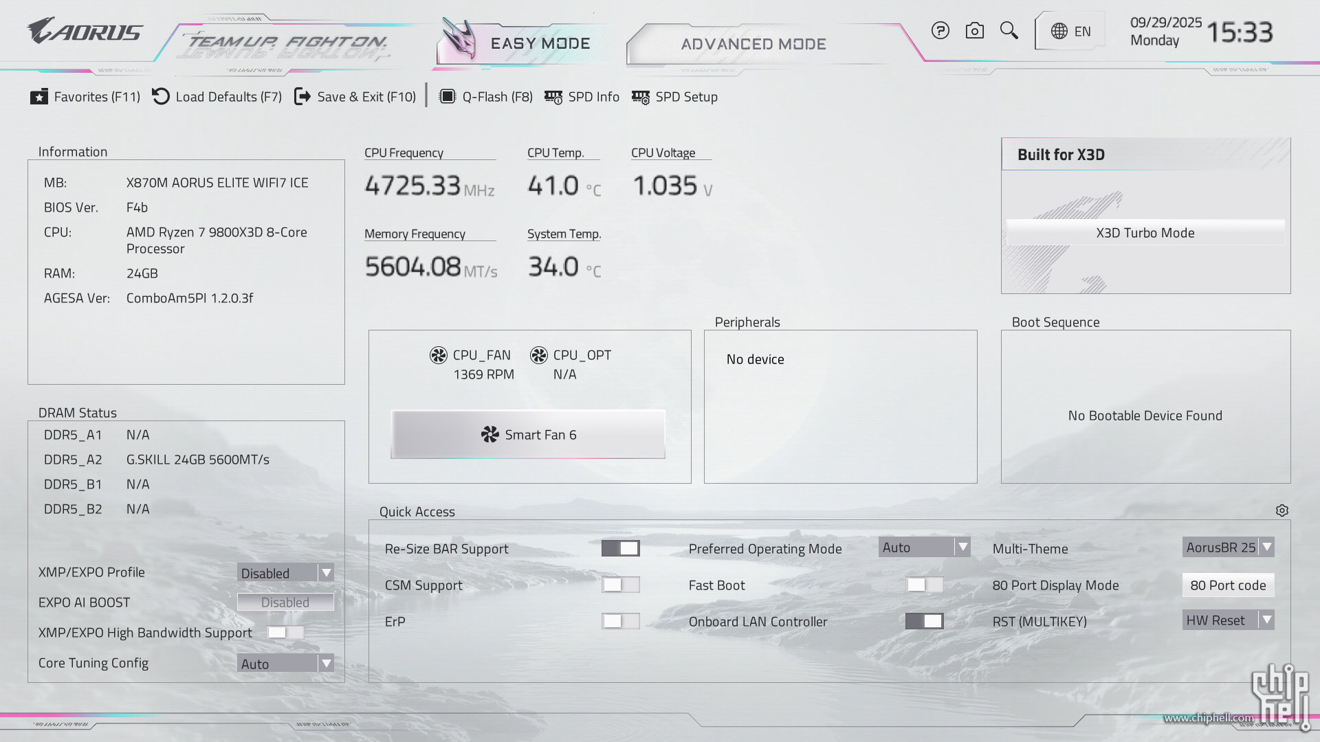 全新设计的界面布局,维持技嘉一贯的扁平排布风格,并使用白色为主题色. 进入BIOS后默认为简易模式,可查阅一些基本信息,并可快速调节一些例如XMP/EXPO开启,Smart Fan风扇调整,X3D Turbo Mode功能,Q-Flash更新BIOS,内存SPD信息和配置等. Smart Fan风扇调整提供了图形化的界面,可供用户更加方便的进行自定义. Q-Flash和内存配置相关页面. 按下F2切换至高级模式,默认切换到Favorites主菜单,可以收藏选项来方便快速进入. Tweaker主菜单,提供了各种与性能相关的调节选项.包括CPU频率,内存频率以及对应的电压和功耗等条目. PBO选项,提供手动模式,可使得高阶用户可以进行更加精细的手动调节. Curve Optimizer电压曲线优化设定,通过调节PBO电压对应的频率曲线,可以实现降压超频. 内存XMP/EXPO配置文件一键载入,并设有对应调节的选项. 电压控制子菜单,如CPU核心和PM,Misc等电压数值的调节. 主板提供可调节的电压条目,模式,数值: CPU防掉压设置,设有Auto/Normal/Standard/Low/Medium/High/Turbo/Extreme总计8个调节选项. Settings主菜单,包含电源选项,I/O接口,AMD CBS设置,AMD超频选项以及电脑状态. 进入AMD CBS设置. 内存时序控制,提供了比较详细的时序参数可供调节. CPU通用选项,可以对核显和音频进行调整. System Info主菜单,可以看到当前主板的状态. Boot主菜单,可以修改启动选项. |