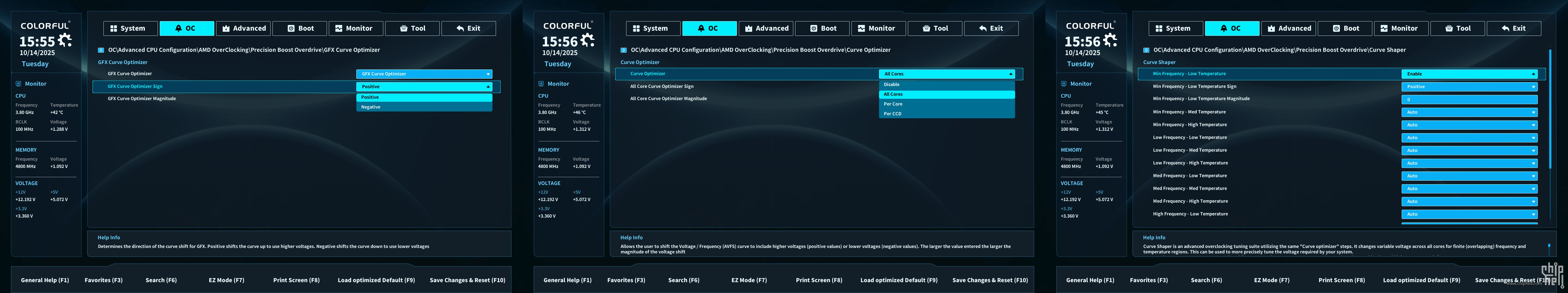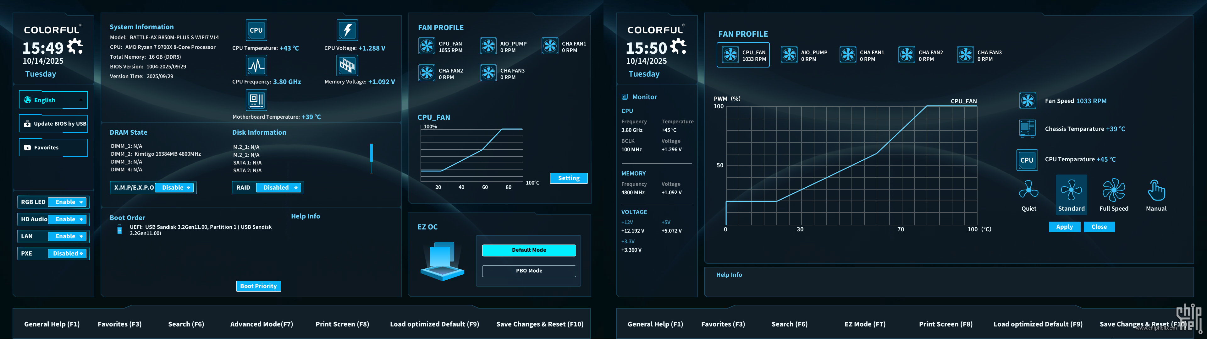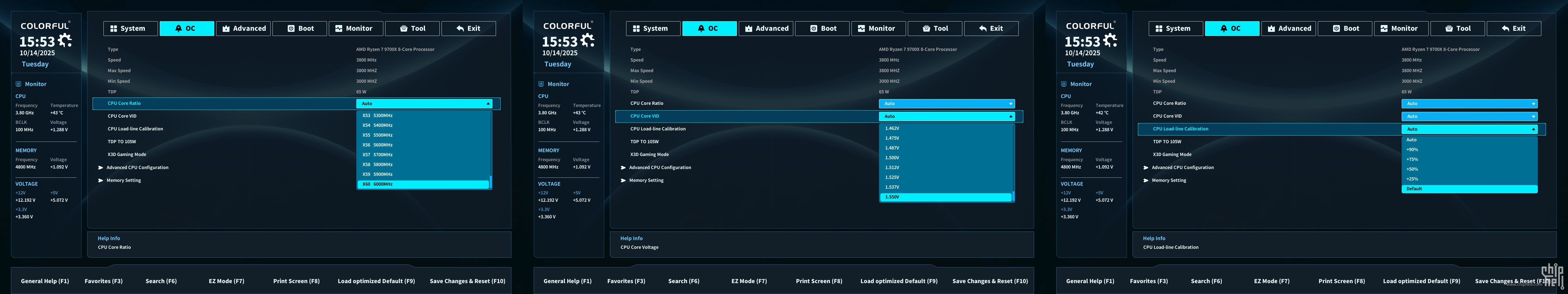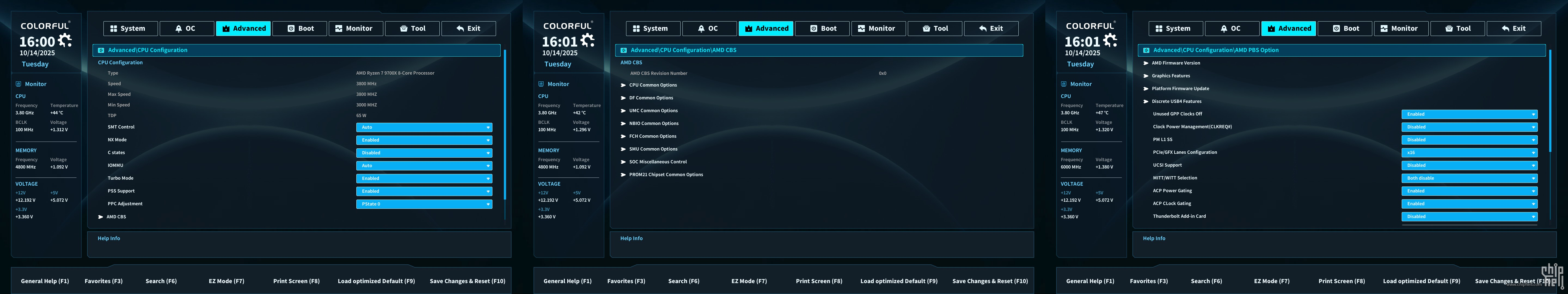 界面为全新高清化风格,布局都做了重新设计,整体逻辑更加清晰简介. 进入BIOS后默认为EZ模式,可对主机运行状况进行一个概览,可一键开启PBO,并提供一些例如XMP加载,外围设备开关等常用的快速设置,并提供图形化的风扇曲线调整界面. 按下F7可切换为高级模式, 系统主菜单可查询当前的主板信息,以及查看所搭载的硬件信息. OC主菜单,提供与超频有关的各类可调选项.可调整对CPU倍频进行超频,并提供一键105W的TDP快捷开关,以及针对X3D系列处理器优化的游戏模式. 作为子菜单收录的高级CPU设定,设有PState调节,SOC/非核心全频率运行,AVX512,以及FCH展频设定开关.并提供AMD Overclocking层级菜单,可进行一些其他OC方面,例如SMT控制,LN2模式之类的高阶设定. 经典AMD PBO,除了自动和开启关闭模式以外,还提供高阶的手动模式,以及Curve优化修正. AMD Overclocking中还提供CPU核心计数控制. 内存设定子菜单,提供了相对完整的内存参数和相关设定可供调节,例如XMP/EXPO模式的选择,内存频率,FCLK频率,UCLK DIV1模式,延迟加速等,以及与内存有关的电压调节项目也在放置于在该页面中. 主板可提供的电压调节条目模式以及数值: Advanced主菜单,可对平台的一些特性,外围设备,以及若干杂项等进行设定. CPU特性,AMD CBS以及PBS选项也没有缺失. 电源及内置设备选项. Boot主菜单,可对启动的相关设定,以及引导顺序进行设定. Monitor主菜单,可查看CPU和主板的温度,各类电压等.风扇转速等实时运行参数.包括风扇接口的调节入口子菜单也被放置其中. 所有风扇接口均提供基本/全速/安静/手动四个预设模式.手动模式下支持4温度点曲线设定. Tool主菜单,提供U盘BIOS升级,BI0OS档保存,以及收藏夹功能. |