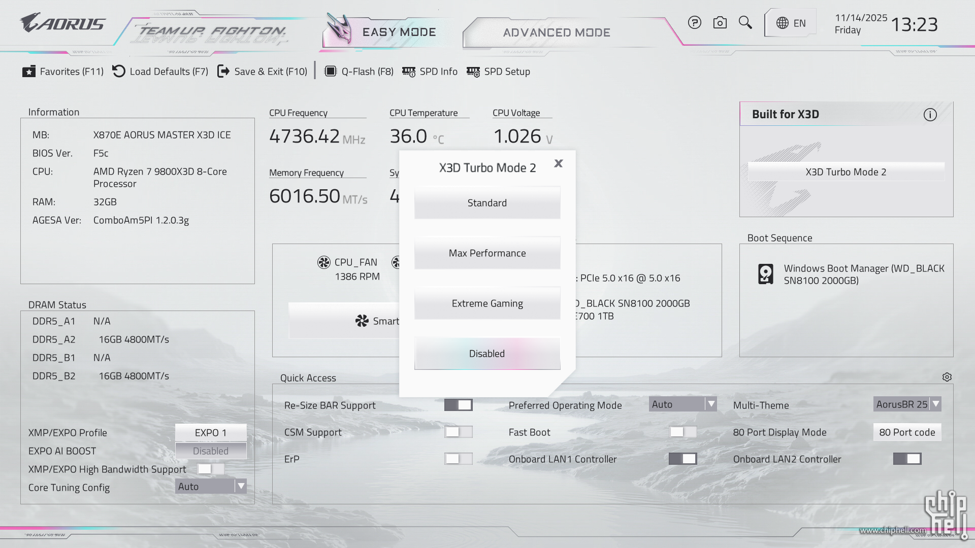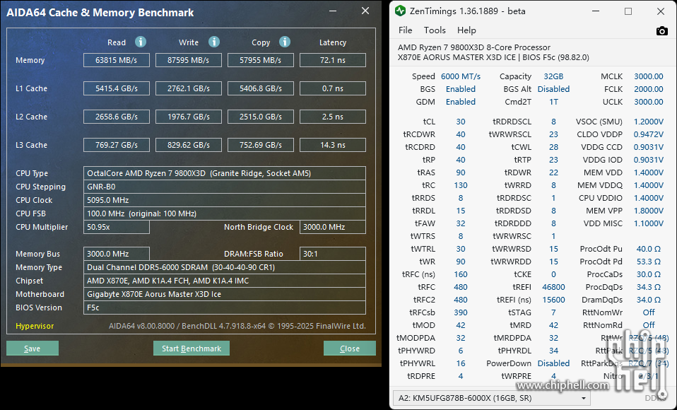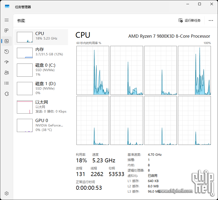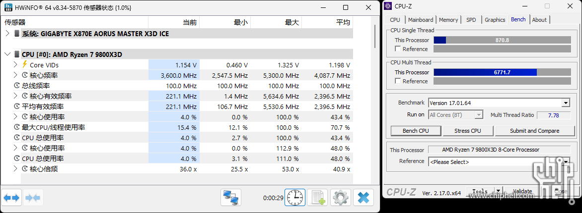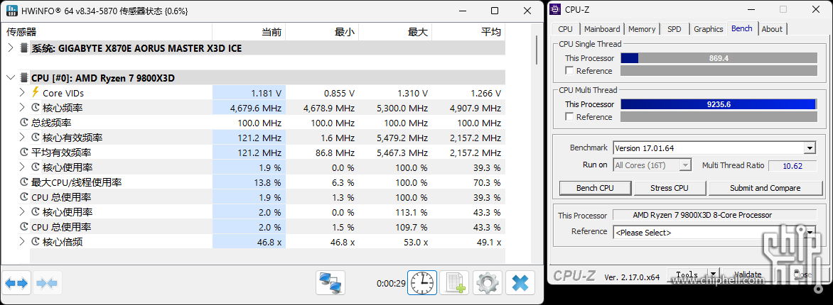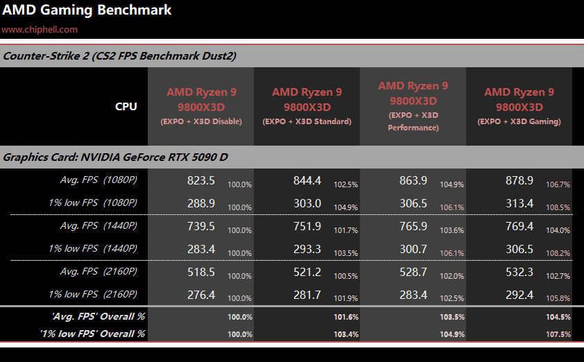 在BIOS中可以看到, X3D Turbo Mode 2共设有Standard/Max Performance/Extreme Gaming/Disabled四个档位.本次测试统一打开内存EXPO,并分别测试这四个档位的CPU/内存以及CS2游戏的表现. 首先是Disabled关闭档位下的表现. CPU-Z的单核分数为810,多核分数为8727.使用HWiNFO监测到CPU最高频率为5.25GHz左右. 内存读写及延迟的跑分. 其次是Auto自动档位下的表现. CPU-Z的单核分数为838.7,多核分数为9026.4.使用HWiNFO监测到CPU最高频率为5.44GHz左右. 内存读写及延迟的跑分无明显变化. 再来看Max Performance最佳性能档位下的表现. CPU-Z的单核分数为869.4,多核分数为9235.6.使用HWiNFO监测到CPU最高频率为5.47GHz左右. 内存读写及延迟的跑分无明显变化. 最后来看Extreme Gaming极限游戏档位下的表现. CPU-Z的单核分数为870.8,多核分数为6771.7.使用HWiNFO监测到CPU最高频率为5.63GHz左右. 此时查看任务管理器可以看到,CPU正以8C8T的规格在运行,说明该模式下超线程被关闭了. 而内存读写及延迟的跑分均有明显提升. CS2游戏测试环节,可以看到测试结果呈递增的趋势,表现最差的为Disabled关闭档位,表现最好的为Extreme Gaming极限游戏档位. |
