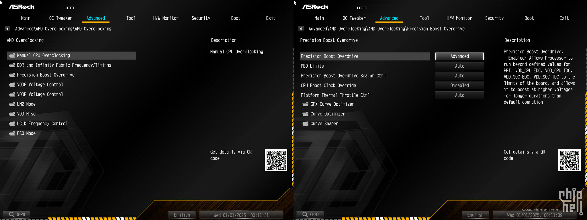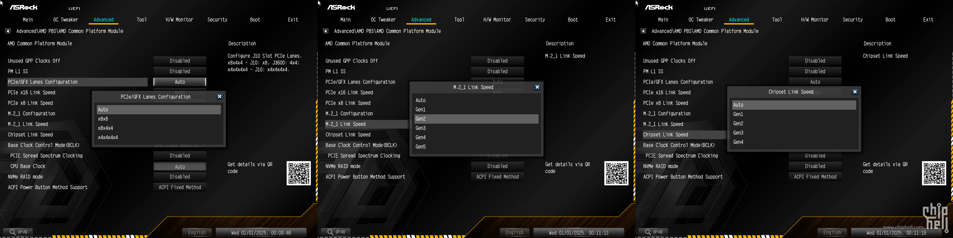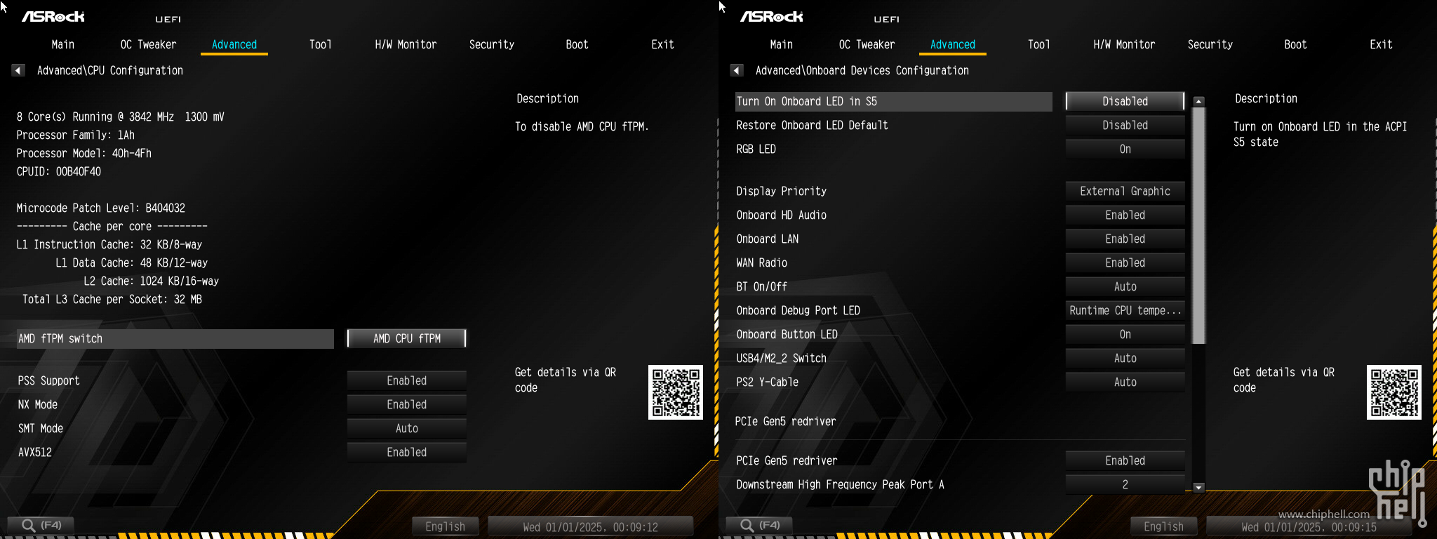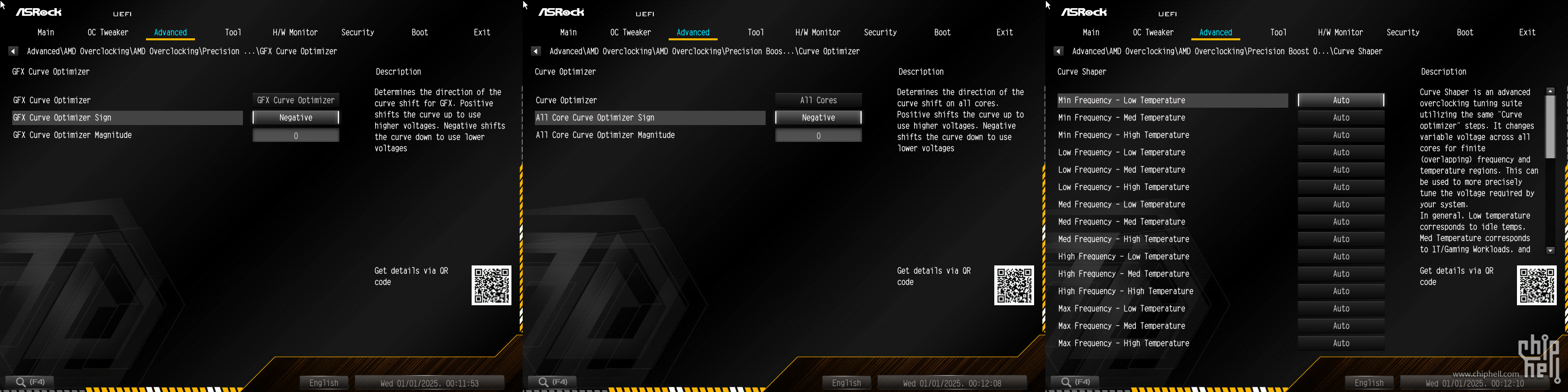 本代ASRock主板的UEFI BIOS设置界面并未做翻新.操作方式与设置项分类分类逻辑均和过往相似.在本块主板上,主题改为了Taichi系列的黑黄配色. 进入BIOS后直接进入更多选项的进阶模式,无简易模式. OC Tweaker界面,有关于超频例如频率电压等各类设定都被收录在该界面中,同时BIOS档案保存功能也放置在此页面,并支持从USB设备导入或导出. 设有游戏模式以提升游戏性能;并针对Zen5处理器还有专门的延迟优化模式. 设有105W的快速TDP设定开关;以及针对Cinebench的性能Boost提升模式,以及预置多种的组合式PBO性能优化档案. CPU的每个CCD核心以及集显的倍频可供自由调节,并且可覆写Core VID电压. 内存的规格显示和XMP/EXPO开关位于DRAM Profile Configuration子菜单内,并设有2个等级的内存性能提升模式可供选择. 而详细的内存时序选项,则设置位于另一个DRAM Timing Configuration子菜单内. 调节内存比率的UCLK DIV1调节选项则是被放在主页面中. CPU/SOC的负载防掉压选项,以及一些其他额外电压调节,则被收录在额外电压子菜单中. 主板可提供的电压调节条目模式以及数值: Advanced界面,可对CPU特性,存储设备,USB,板载设备,信任模块等进行设定.页面中还提供了AMD CBS,AMD PBS和AMD原厂超频选项菜单等杂项. CPU特性子菜单,可调节一些CPU特性的功能开闭;板载设备子菜单,可选择开闭RGB,集成声卡,网卡,蓝牙等设备,并可指定首选显示输出设备. 提供了AMD CBS和AMD PBS选项菜单. 各个通道Gen模式的指定也被放置在该PBS菜单中,并支持通道拆分. 提供AMD原厂超频选项菜单,例如经典PBO菜单,除了自动和开闭以外,还开放高阶的手动调教模式,以及Curve优化修正. Tool界面,提供板载RGB灯控调节和重置,以及BIOS刷新工具,SSD安全擦除功能等. H/W Monitor界面,提供温度/电压/风扇转速的监控,以及各个风扇接口的调节. 每个接口都预设自定义/安静/标准/性能/全速,共五个风扇模式,除CPU Fan接口固定温度来源以外,其余接口均可自定义温度来源,并都支持风扇停转技术.手动模式下提供4点曲线调节,且机箱风扇可以切换成连接水泵用途. 还提供图形化风扇曲线调节以简化操作. Boot界面,可对启动引导项,以及一些开机启动设定进行修改. |