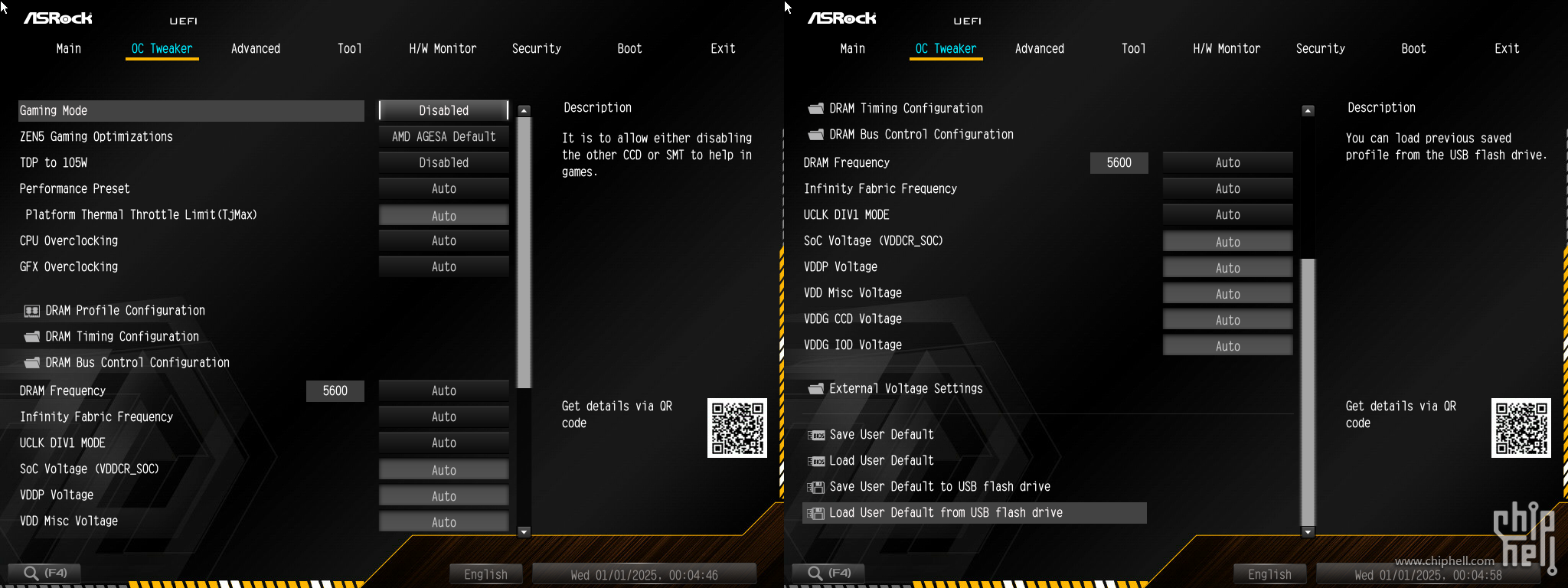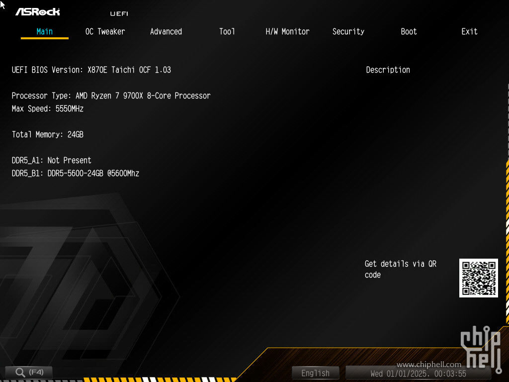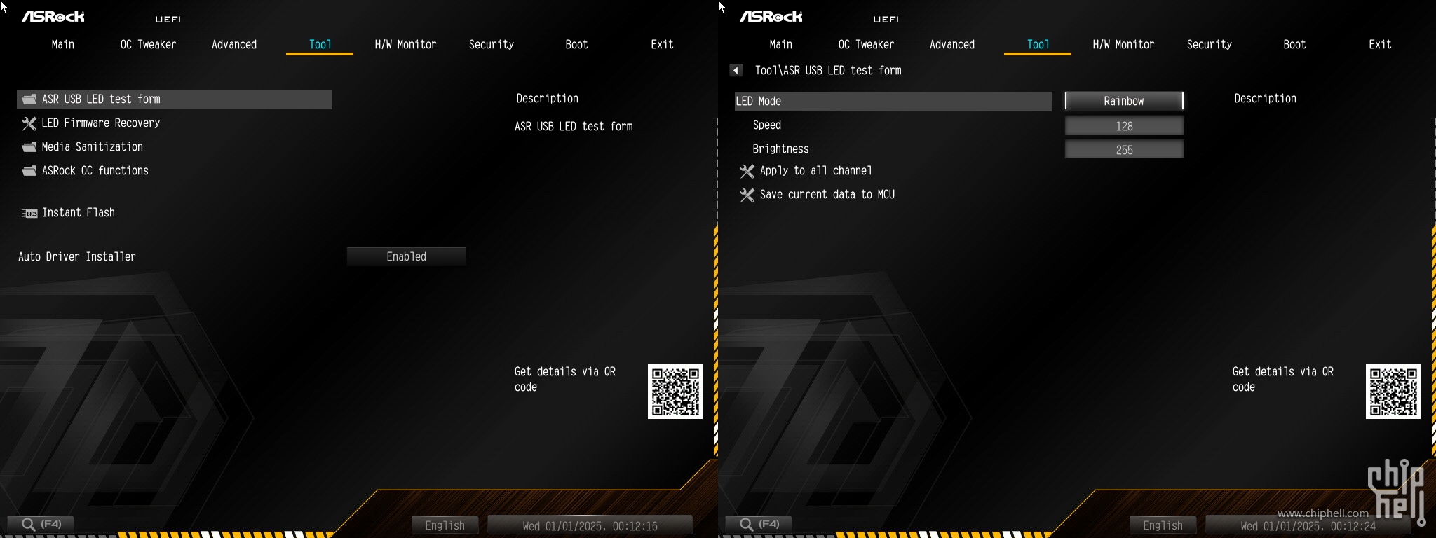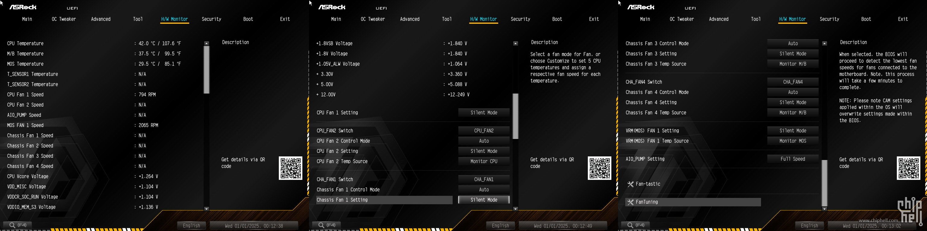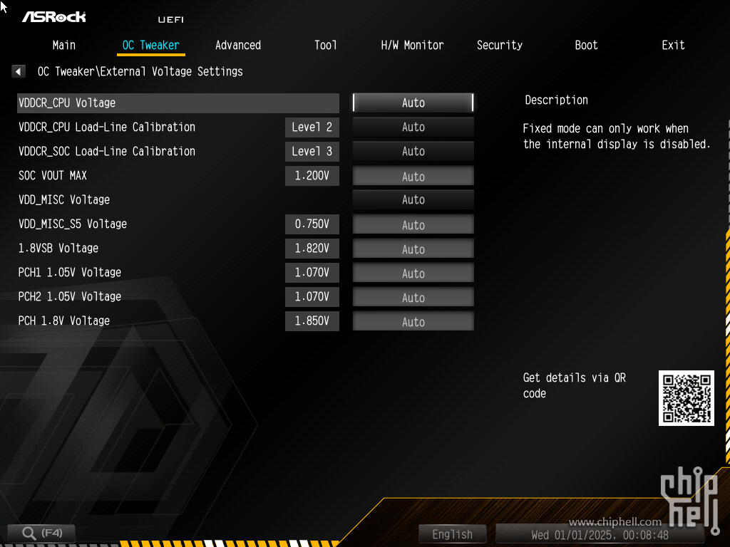 本代ASRock主板的UEFI BIOS设置界面并未做翻新.操作方式与设置项分类分类逻辑均和过往相似.在本块主板上,主题改为了Taichi系列的黑黄配色. 进入BIOS后直接进入更多选项的进阶模式,无简易模式. OC Tweaker界面,有关于超频例如频率电压等各类设定都被收录在该界面中,同时BIOS档案保存功能也放置在此页面,并支持从USB设备导入或导出. 设有游戏模式以提升游戏性能;并针对Zen5处理器还有专门的延迟优化模式. 设有105W的快速TDP设定开关;以及针对Cinebench的性能Boost提升模式,以及预置多种的组合式PBO性能优化档案. CPU的每个CCD核心以及集显的倍频可供自由调节,并且可覆写Core VID电压. 内存的规格显示和XMP/EXPO开关位于DRAM Profile Configuration子菜单内,并设有2个等级的内存性能提升模式可供选择. 而详细的内存时序选项,则设置位于另一个DRAM Timing Configuration子菜单内. 调节内存比率的UCLK DIV1调节选项则是被放在主页面中. CPU/SOC的负载防掉压选项,以及一些其他额外电压调节,则被收录在额外电压子菜单中. 主板可提供的电压调节条目模式以及数值: Advanced界面,可对CPU特性,存储设备,USB,板载设备,信任模块等进行设定.页面中还提供了AMD CBS,AMD PBS和AMD原厂超频选项菜单等杂项. CPU特性子菜单,可调节一些CPU特性的功能开闭;板载设备子菜单,可选择开闭RGB,集成声卡,网卡,蓝牙等设备,并可指定首选显示输出设备. 提供了AMD CBS和AMD PBS选项菜单. 各个通道Gen模式的指定也被放置在该PBS菜单中,并支持通道拆分. 提供AMD原厂超频选项菜单,例如经典PBO菜单,除了自动和开闭以外,还开放高阶的手动调教模式,以及Curve优化修正. Tool界面,提供板载RGB灯控调节和重置,以及BIOS刷新工具,SSD安全擦除功能等. H/W Monitor界面,提供温度/电压/风扇转速的监控,以及各个风扇接口的调节. 每个接口都预设自定义/安静/标准/性能/全速,共五个风扇模式,除CPU Fan接口固定温度来源以外,其余接口均可自定义温度来源,并都支持风扇停转技术.手动模式下提供4点曲线调节,且机箱风扇可以切换成连接水泵用途. 还提供图形化风扇曲线调节以简化操作. Boot界面,可对启动引导项,以及一些开机启动设定进行修改. |
