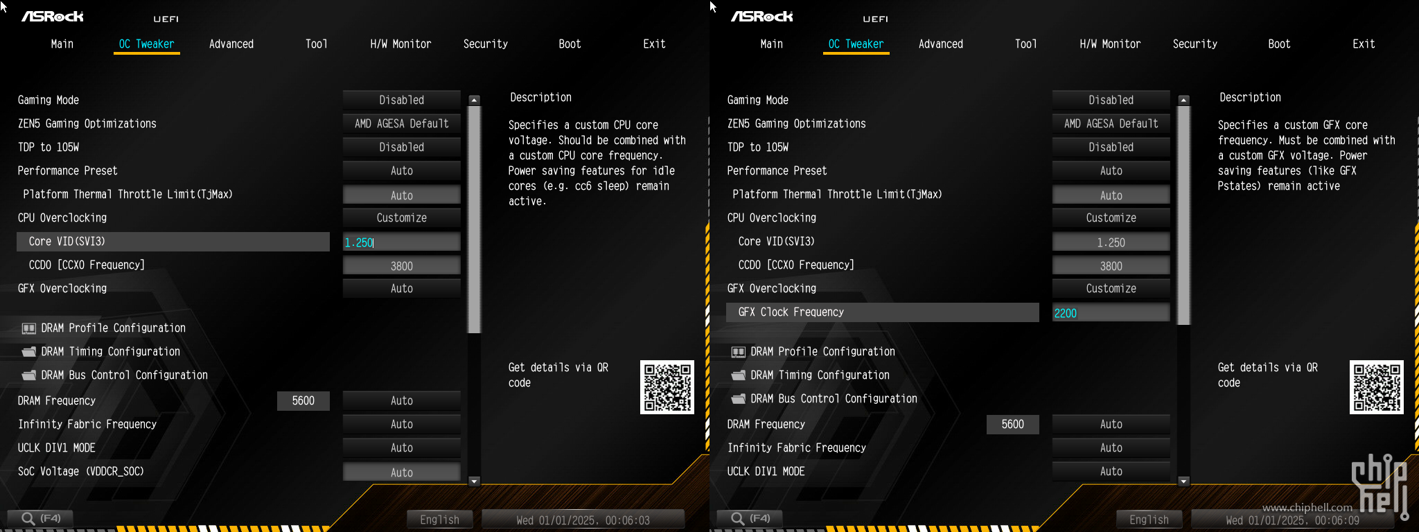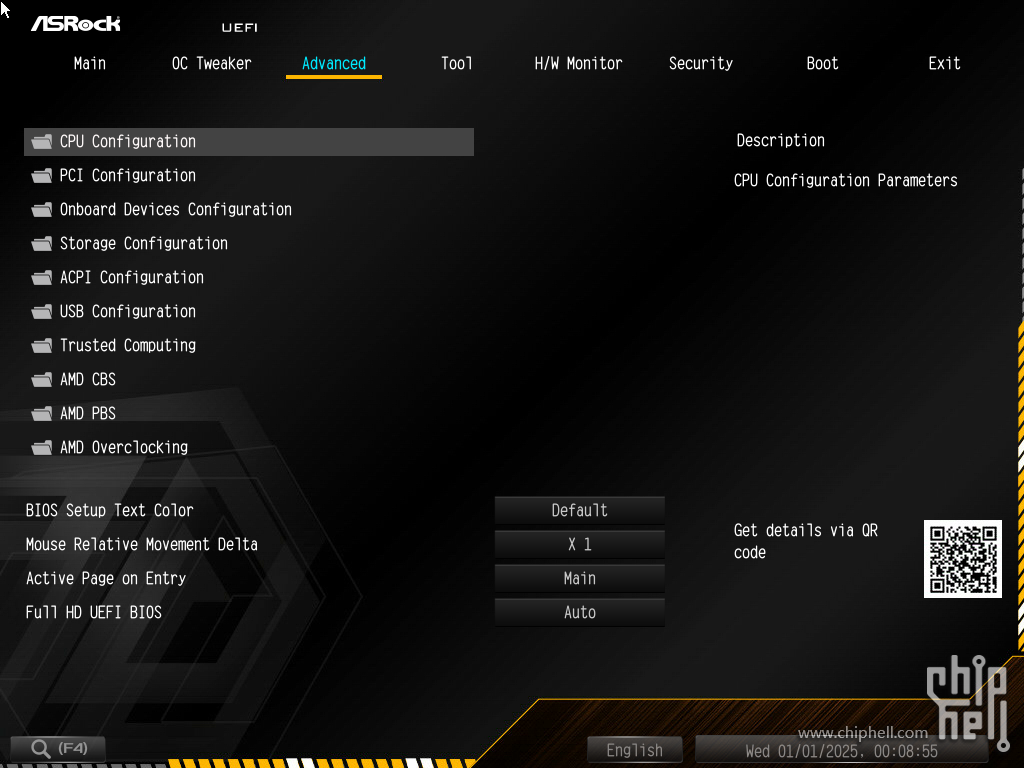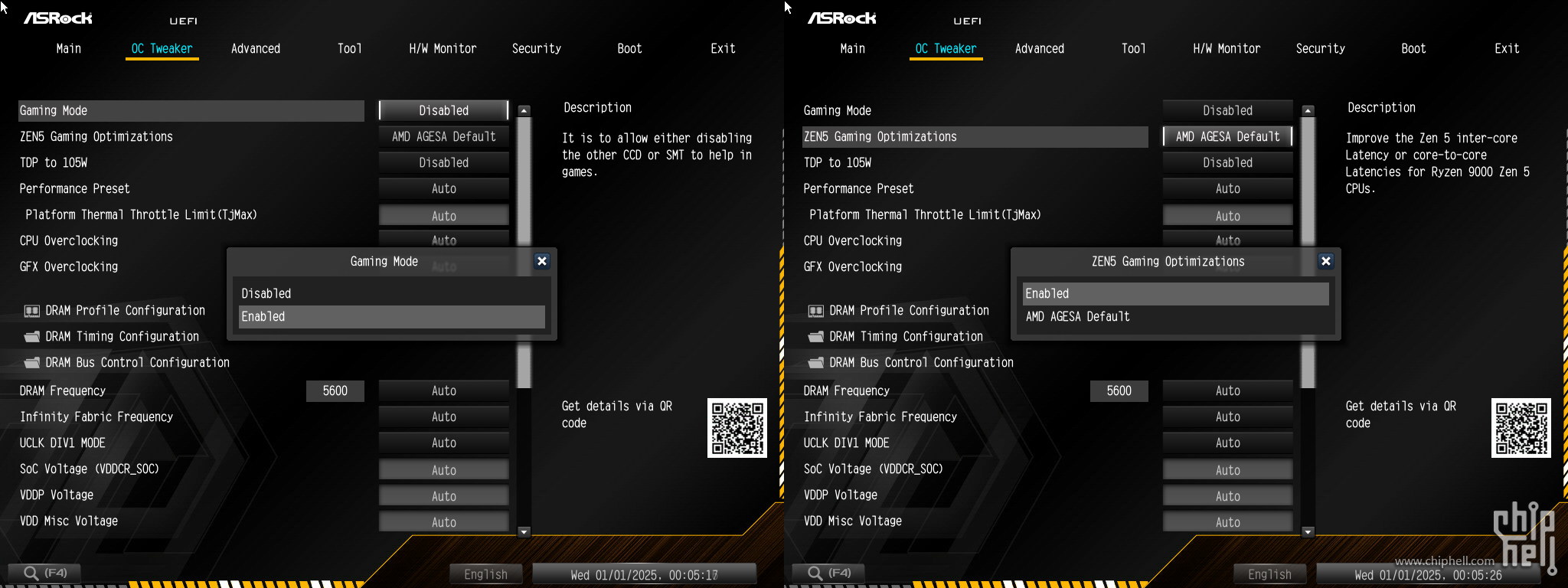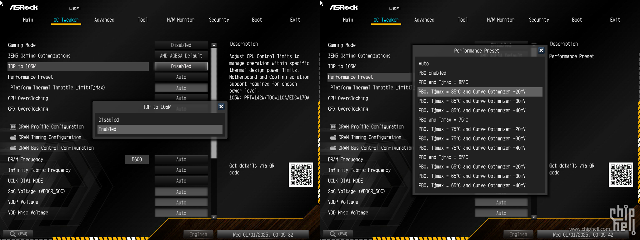 本代ASRock主板的UEFI BIOS设置界面并未做翻新.操作方式与设置项分类分类逻辑均和过往相似.在本块主板上,主题改为了Taichi系列的黑黄配色. 进入BIOS后直接进入更多选项的进阶模式,无简易模式. OC Tweaker界面,有关于超频例如频率电压等各类设定都被收录在该界面中,同时BIOS档案保存功能也放置在此页面,并支持从USB设备导入或导出. 设有游戏模式以提升游戏性能;并针对Zen5处理器还有专门的延迟优化模式. 设有105W的快速TDP设定开关;以及针对Cinebench的性能Boost提升模式,以及预置多种的组合式PBO性能优化档案. CPU的每个CCD核心以及集显的倍频可供自由调节,并且可覆写Core VID电压. 内存的规格显示和XMP/EXPO开关位于DRAM Profile Configuration子菜单内,并设有2个等级的内存性能提升模式可供选择. 而详细的内存时序选项,则设置位于另一个DRAM Timing Configuration子菜单内. 调节内存比率的UCLK DIV1调节选项则是被放在主页面中. CPU/SOC的负载防掉压选项,以及一些其他额外电压调节,则被收录在额外电压子菜单中. 主板可提供的电压调节条目模式以及数值: Advanced界面,可对CPU特性,存储设备,USB,板载设备,信任模块等进行设定.页面中还提供了AMD CBS,AMD PBS和AMD原厂超频选项菜单等杂项. CPU特性子菜单,可调节一些CPU特性的功能开闭;板载设备子菜单,可选择开闭RGB,集成声卡,网卡,蓝牙等设备,并可指定首选显示输出设备. 提供了AMD CBS和AMD PBS选项菜单. 各个通道Gen模式的指定也被放置在该PBS菜单中,并支持通道拆分. 提供AMD原厂超频选项菜单,例如经典PBO菜单,除了自动和开闭以外,还开放高阶的手动调教模式,以及Curve优化修正. Tool界面,提供板载RGB灯控调节和重置,以及BIOS刷新工具,SSD安全擦除功能等. H/W Monitor界面,提供温度/电压/风扇转速的监控,以及各个风扇接口的调节. 每个接口都预设自定义/安静/标准/性能/全速,共五个风扇模式,除CPU Fan接口固定温度来源以外,其余接口均可自定义温度来源,并都支持风扇停转技术.手动模式下提供4点曲线调节,且机箱风扇可以切换成连接水泵用途. 还提供图形化风扇曲线调节以简化操作. Boot界面,可对启动引导项,以及一些开机启动设定进行修改. |