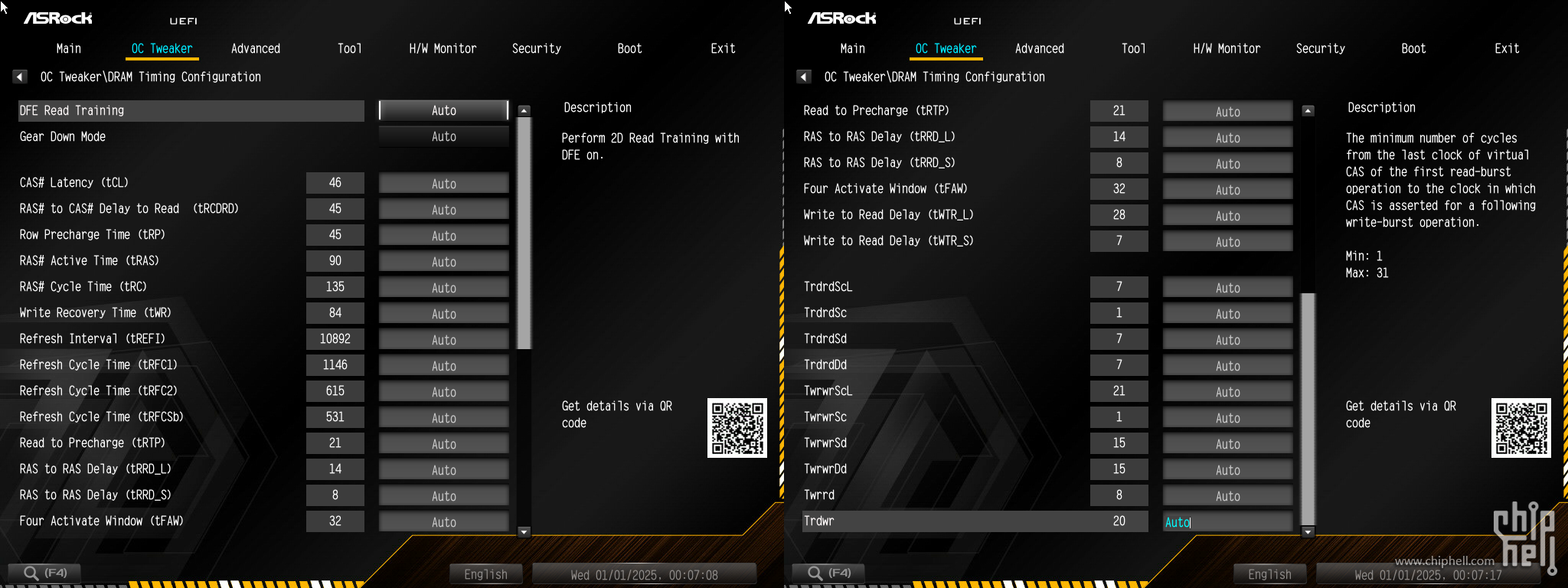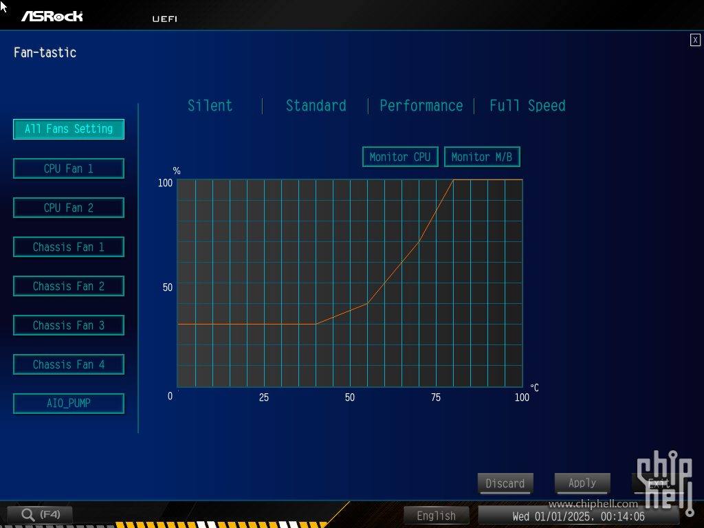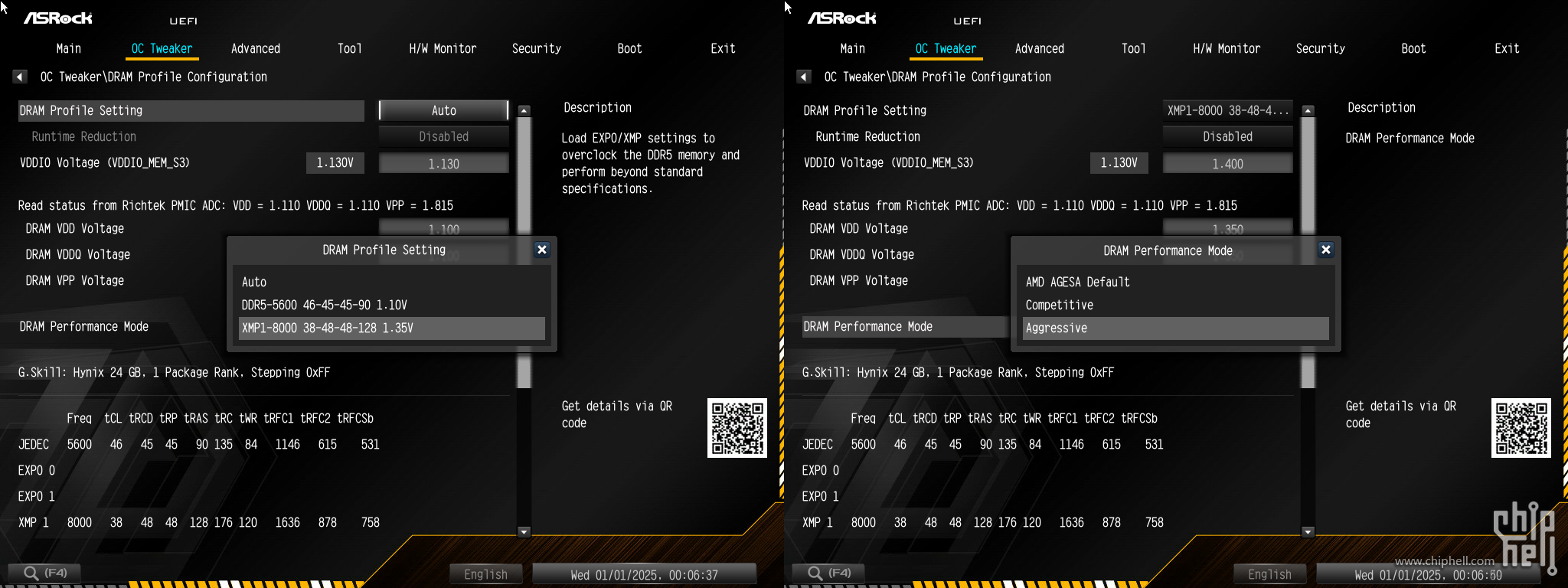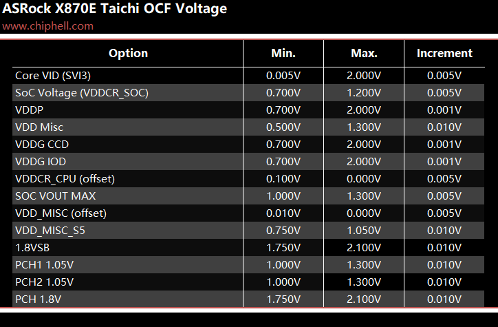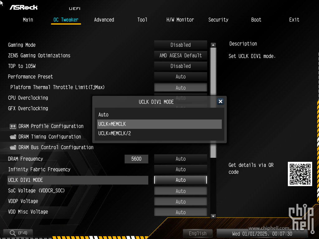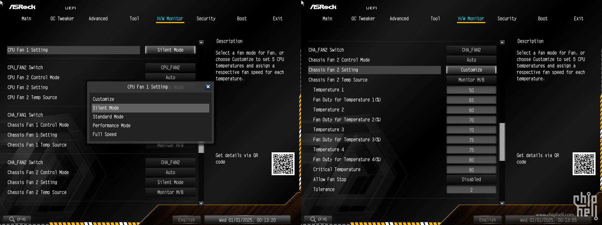 本代ASRock主板的UEFI BIOS设置界面并未做翻新.操作方式与设置项分类分类逻辑均和过往相似.在本块主板上,主题改为了Taichi系列的黑黄配色. 进入BIOS后直接进入更多选项的进阶模式,无简易模式. OC Tweaker界面,有关于超频例如频率电压等各类设定都被收录在该界面中,同时BIOS档案保存功能也放置在此页面,并支持从USB设备导入或导出. 设有游戏模式以提升游戏性能;并针对Zen5处理器还有专门的延迟优化模式. 设有105W的快速TDP设定开关;以及针对Cinebench的性能Boost提升模式,以及预置多种的组合式PBO性能优化档案. CPU的每个CCD核心以及集显的倍频可供自由调节,并且可覆写Core VID电压. 内存的规格显示和XMP/EXPO开关位于DRAM Profile Configuration子菜单内,并设有2个等级的内存性能提升模式可供选择. 而详细的内存时序选项,则设置位于另一个DRAM Timing Configuration子菜单内. 调节内存比率的UCLK DIV1调节选项则是被放在主页面中. CPU/SOC的负载防掉压选项,以及一些其他额外电压调节,则被收录在额外电压子菜单中. 主板可提供的电压调节条目模式以及数值: Advanced界面,可对CPU特性,存储设备,USB,板载设备,信任模块等进行设定.页面中还提供了AMD CBS,AMD PBS和AMD原厂超频选项菜单等杂项. CPU特性子菜单,可调节一些CPU特性的功能开闭;板载设备子菜单,可选择开闭RGB,集成声卡,网卡,蓝牙等设备,并可指定首选显示输出设备. 提供了AMD CBS和AMD PBS选项菜单. 各个通道Gen模式的指定也被放置在该PBS菜单中,并支持通道拆分. 提供AMD原厂超频选项菜单,例如经典PBO菜单,除了自动和开闭以外,还开放高阶的手动调教模式,以及Curve优化修正. Tool界面,提供板载RGB灯控调节和重置,以及BIOS刷新工具,SSD安全擦除功能等. H/W Monitor界面,提供温度/电压/风扇转速的监控,以及各个风扇接口的调节. 每个接口都预设自定义/安静/标准/性能/全速,共五个风扇模式,除CPU Fan接口固定温度来源以外,其余接口均可自定义温度来源,并都支持风扇停转技术.手动模式下提供4点曲线调节,且机箱风扇可以切换成连接水泵用途. 还提供图形化风扇曲线调节以简化操作. Boot界面,可对启动引导项,以及一些开机启动设定进行修改. |
