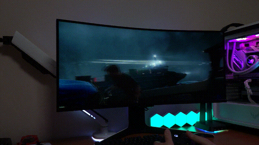 使用刷新率和FPS测试工具UFO test能看出高刷显示器带来的视觉效果。在高速镜头慢放下,旁边肉眼不可见的LED耳机支架和背光板,都出现了明显的闪烁。但雷鸟Q8显示器的画面就稳如老狗,完全没有任何闪烁的情况。 0.5倍速慢放: