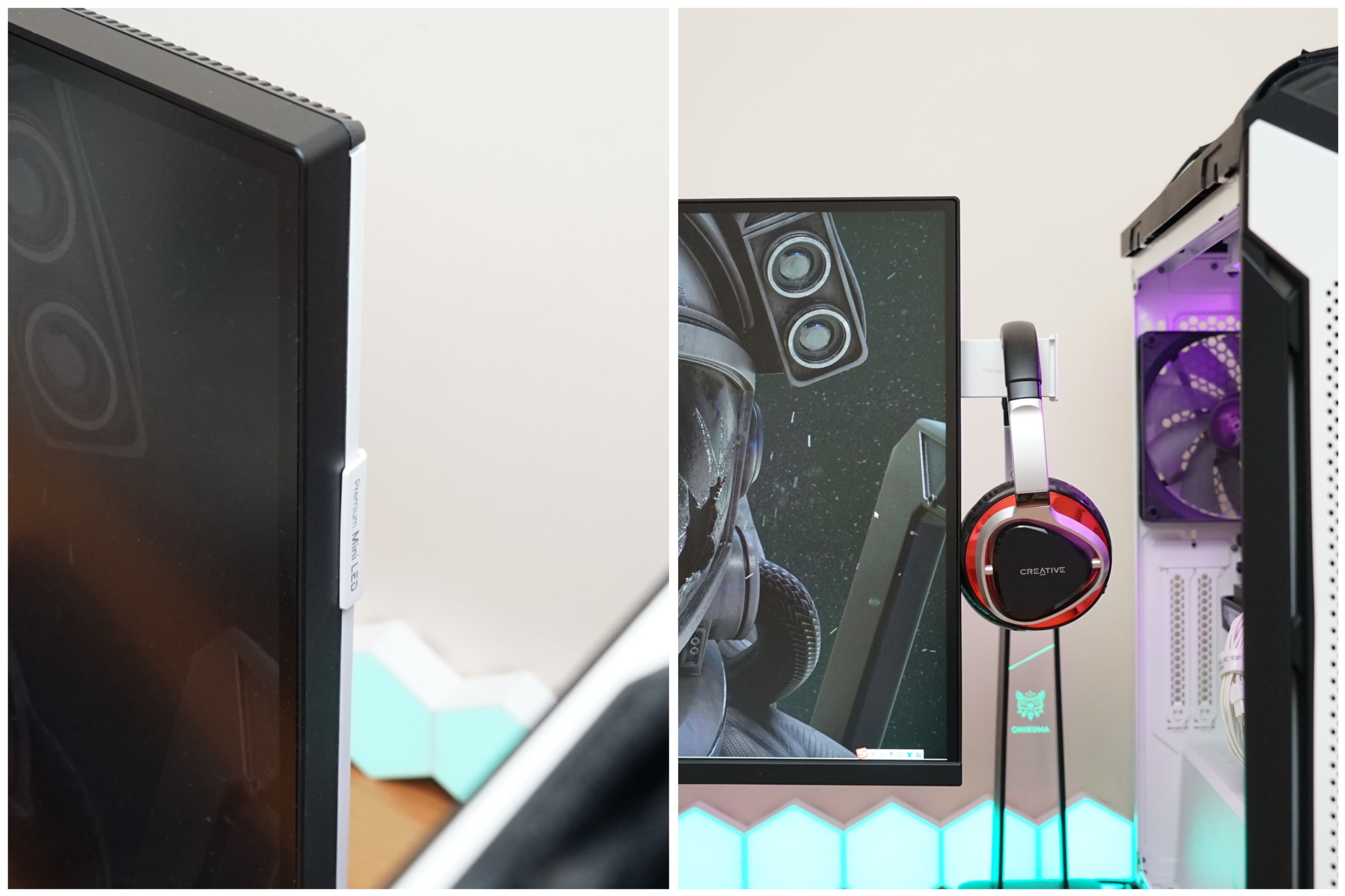 显示器右侧有一个滑轴式耳机挂架,这个非常实用,对于游戏玩家可以不用把耳机放在桌面上占空间,也不用另外购买挂架。