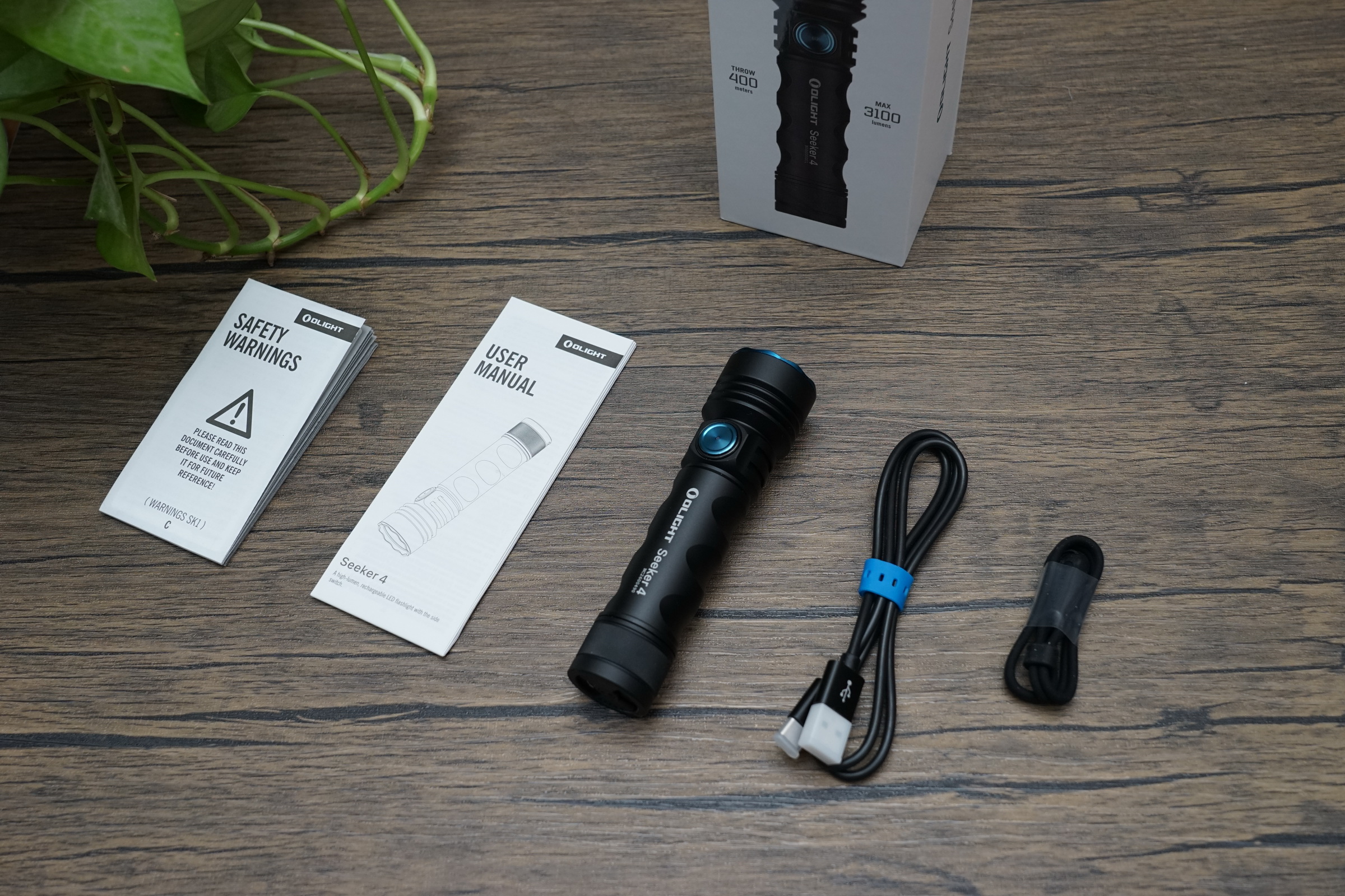产品全家福一览。除了Seeker 4手电外,还有Type-C to USB充电线、挂绳和使用说明。