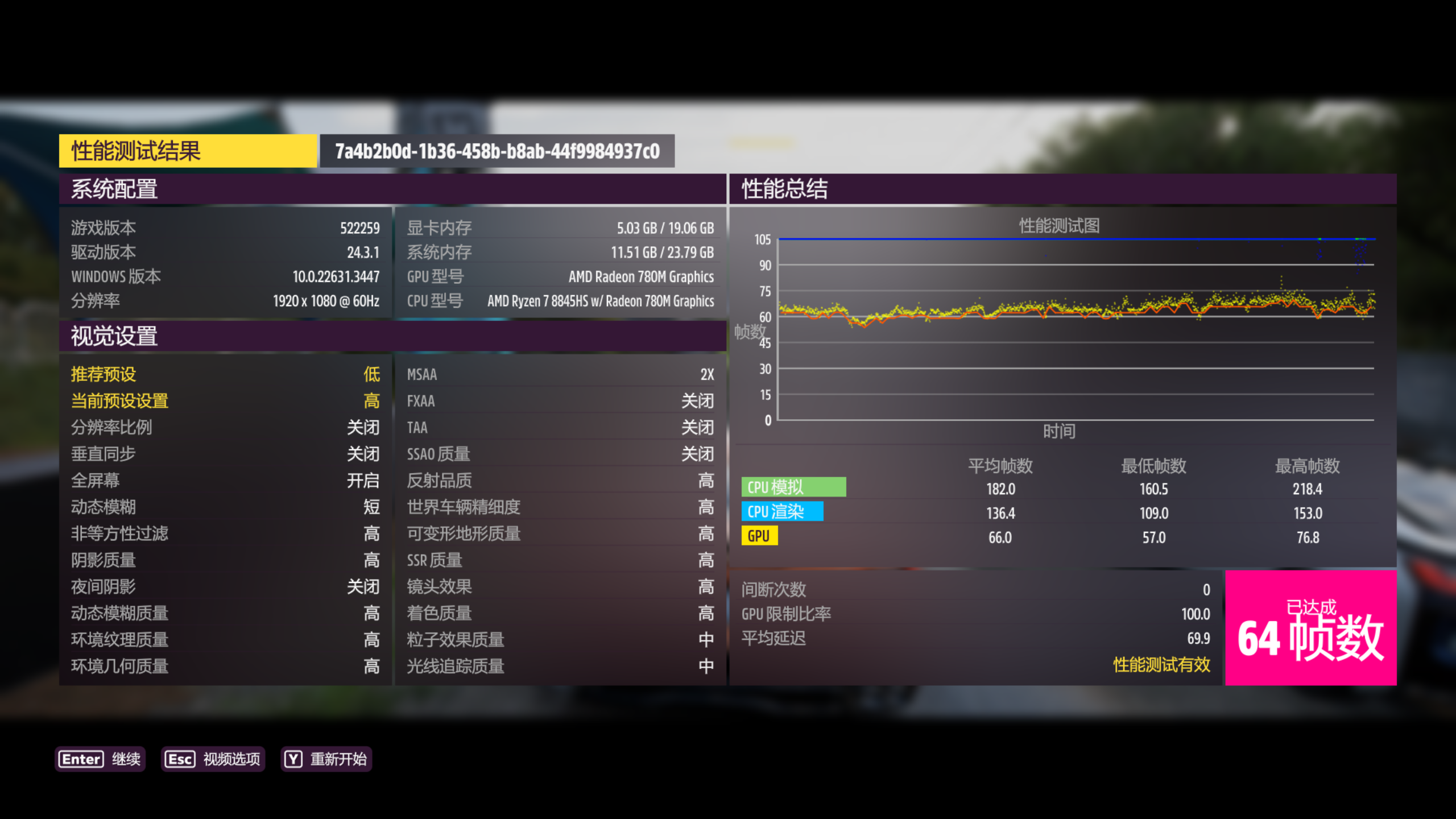 看看在具体游戏中的表现,首先是PC赛车画质大作《极限竞速:地平线5》,它自带了Benchmark功能。