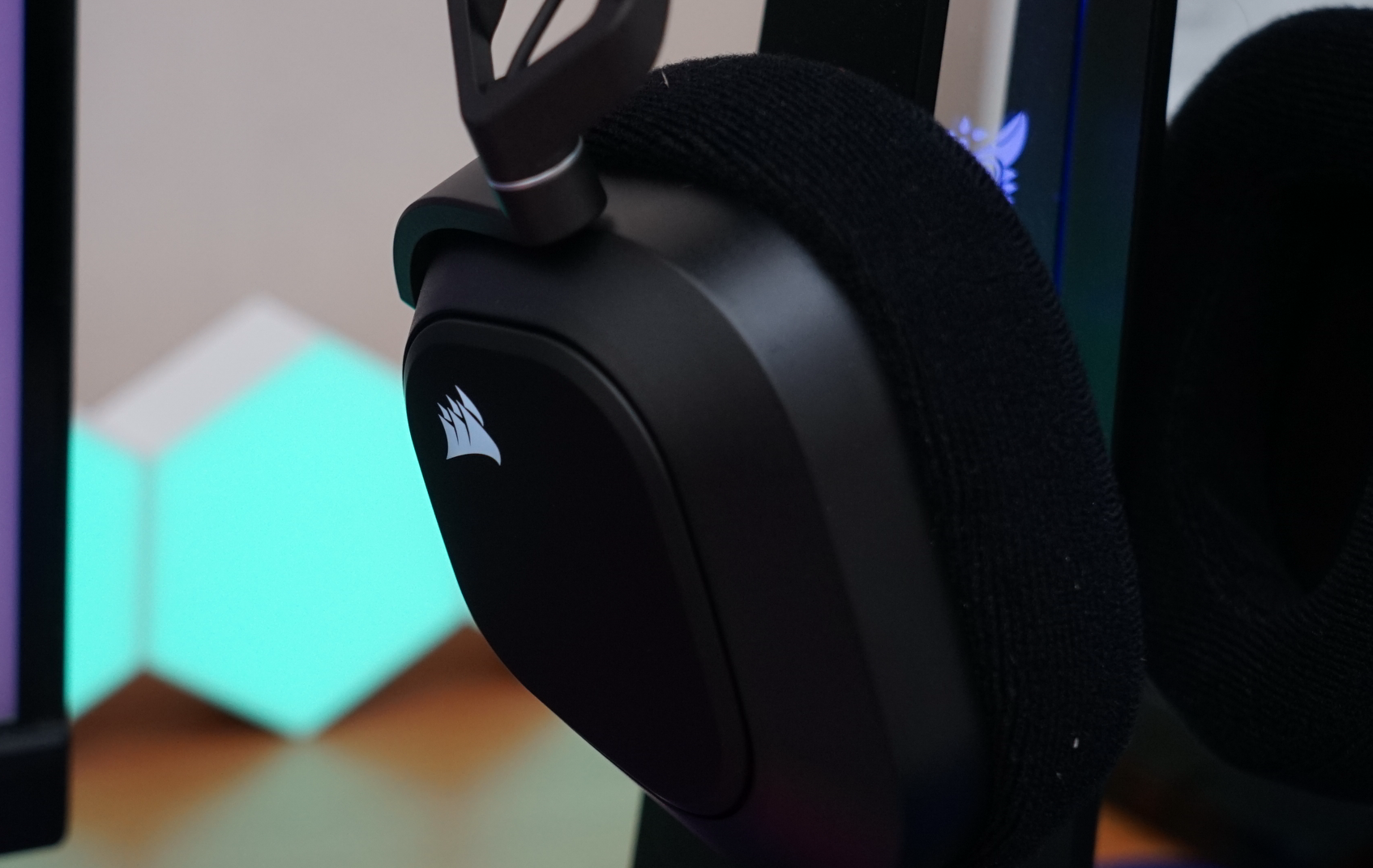 耳机支持2.4GHz无线连接,在美商海盗船的SLIPSTREAM无线技术加持下,可以大幅降低耳机连接后的延迟。同时HS80的接收器上面也带有发光的logo,RGB氛围拉满。
