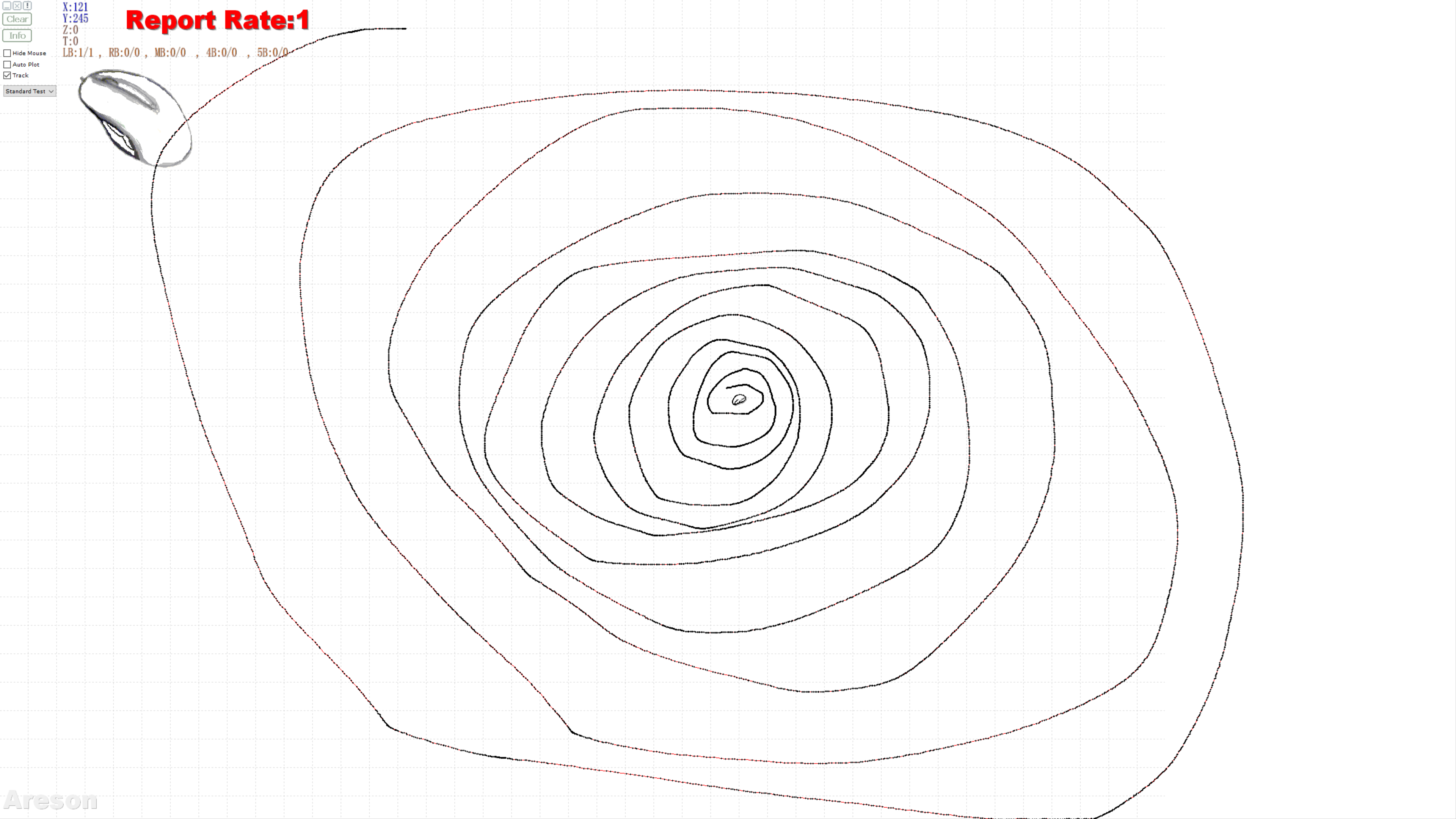 在DPI 3200下,使用mouse test稍微做了几个测试。track模式下可以看到鼠标有没有丢帧、平滑不均匀等问题,点也很密集,看来鼠标的回报率不错。