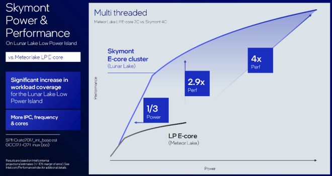 全新的能效核心(Skymont)则是另外一种设计理念,Intel希望让E核能够涵盖更多的日常算力要求,日常应用、非极端重载的情况下,甚至不希望P核运行,从而降低能耗。所以Lunar Lake的E核是按照与Raptor Lake的P核性能相当的目标去设计的,同时还要保持E核级别的能效水平。