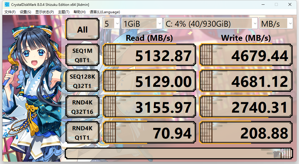 CrystalDiskMark实测,硬盘顺序读写速度达到了5100+MB/s和4679+MB/s,比理论值高了不少,特别是写入。1TB的容量,可安装不少的大软件,同时EQR6还有第二条M.2插槽,方便扩展更大的存储容量。