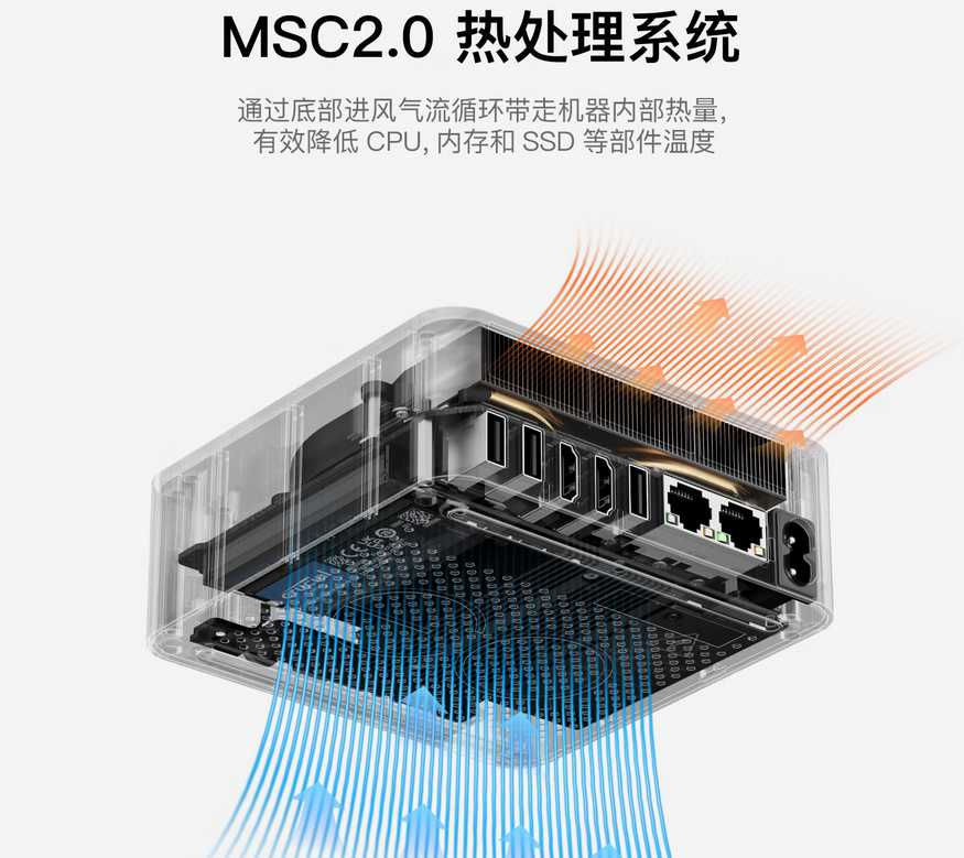 零刻今年推出的几款迷你主机,都升级了MSC2.0热处理系统,大面积的VC均热板+大涡轮静音风扇+改进风道设计,有效降低产品内部电子元件温度,能保持低噪音状态。