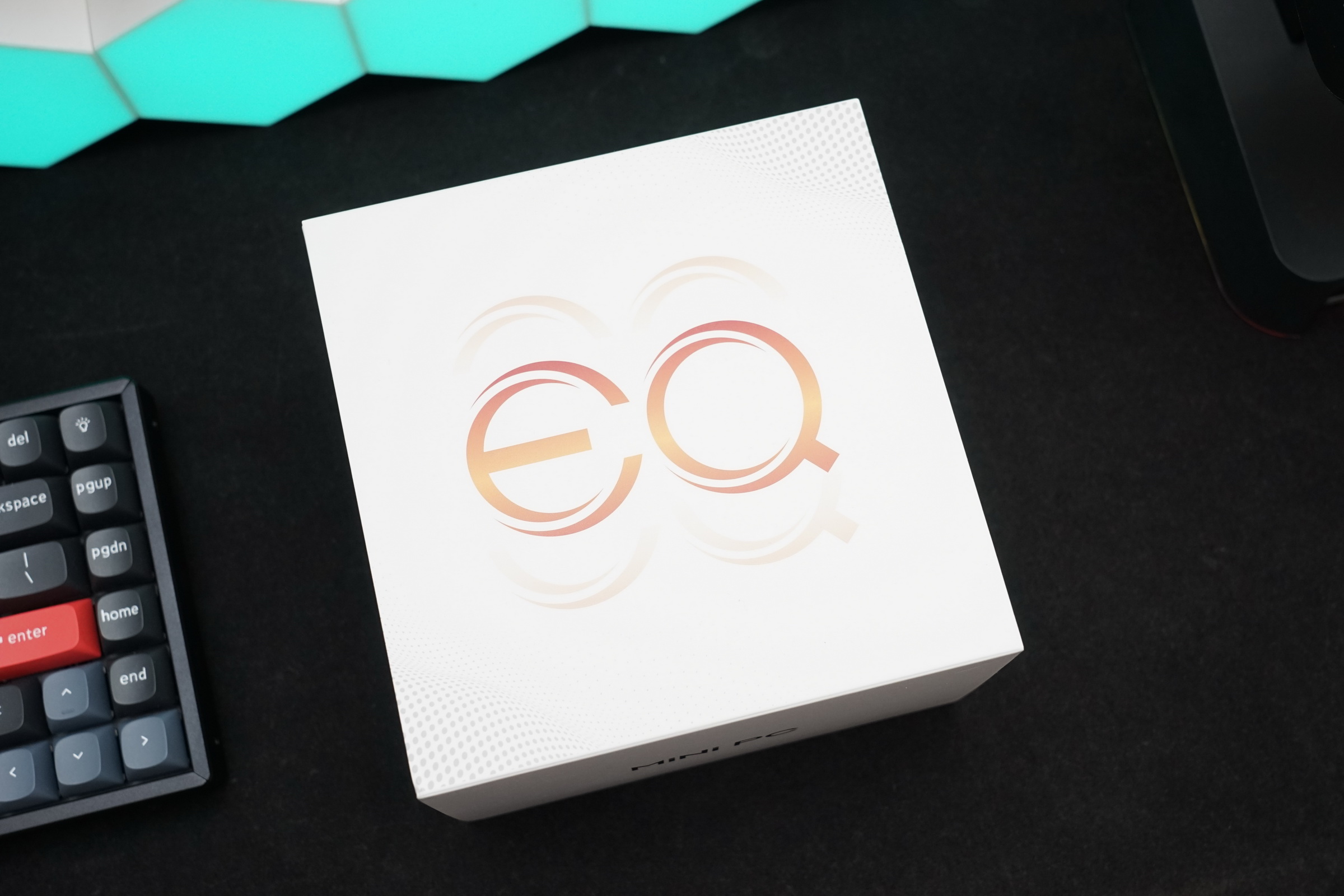 三、使用体验和性能测试: 零刻EQR6的小巧身材,几乎和我的耳机支架底座差不多大,由于内置了电源,可以随便塞在某个角落,放在桌面上完全可以被忽略。