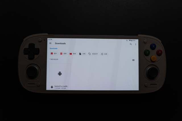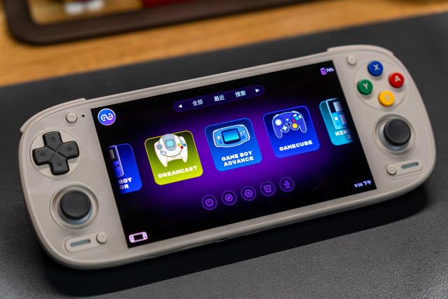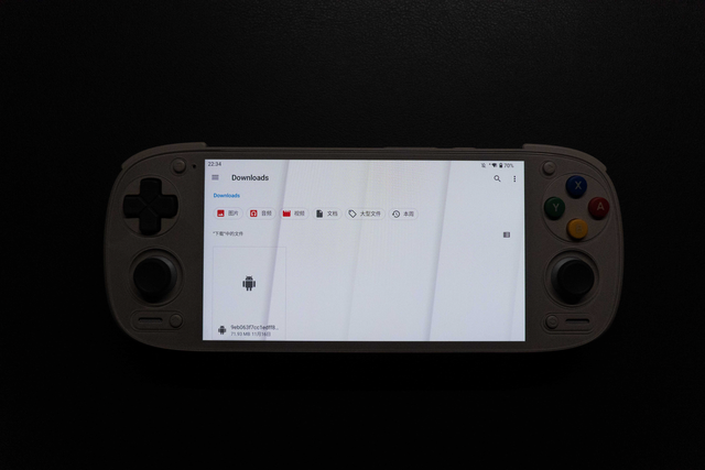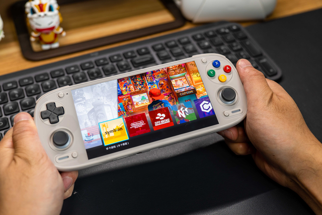 正面按键部分采用了老任的 ABXY 排列,但是布局上十字键在上双摇杆在下,左上为 SELECT 键、右上 START 键、左下安卓 Home 按键、右下安卓返回按键。随机附送了一块钢化膜,按键、摇杆、麦克风、扬声器位置都做了开孔设计,这种打孔钢化膜的成本是非常高的,为一体化前面板定制了这个钢化膜官方应该是下了些成本的。 ▼RP5 这次搭载了新的掌机前端,限于时间还没来得及研究,后续文章/视频再单独分享