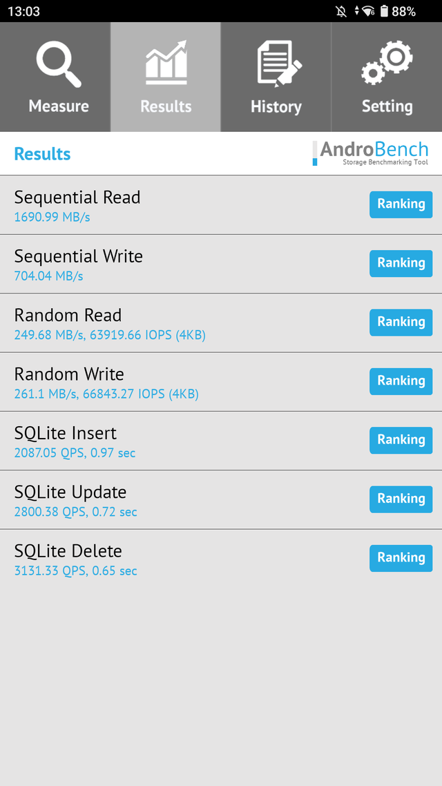 存储部分使用 AndroBench,实测顺序读取速度1690.99MB\s、顺序写入速度704,04MB/s,随机读取速度249.68MB/s、随机写入速度261.1MB/s。