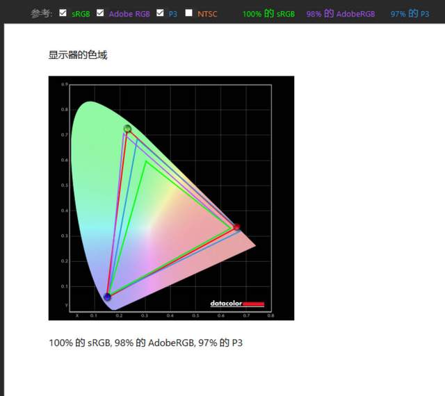 光学测试部分依旧使用 Datacolor 的红蜘蛛进行测试,因为是 OLED 屏幕这次分别测定了最大亮度和最小亮度的数据。 首先是100%亮度下,实测色域覆盖100%sRGB、98%AdobeRGB、97% DCI-P3,是现在 OLED 屏幕比较标准的广色域规格。