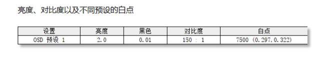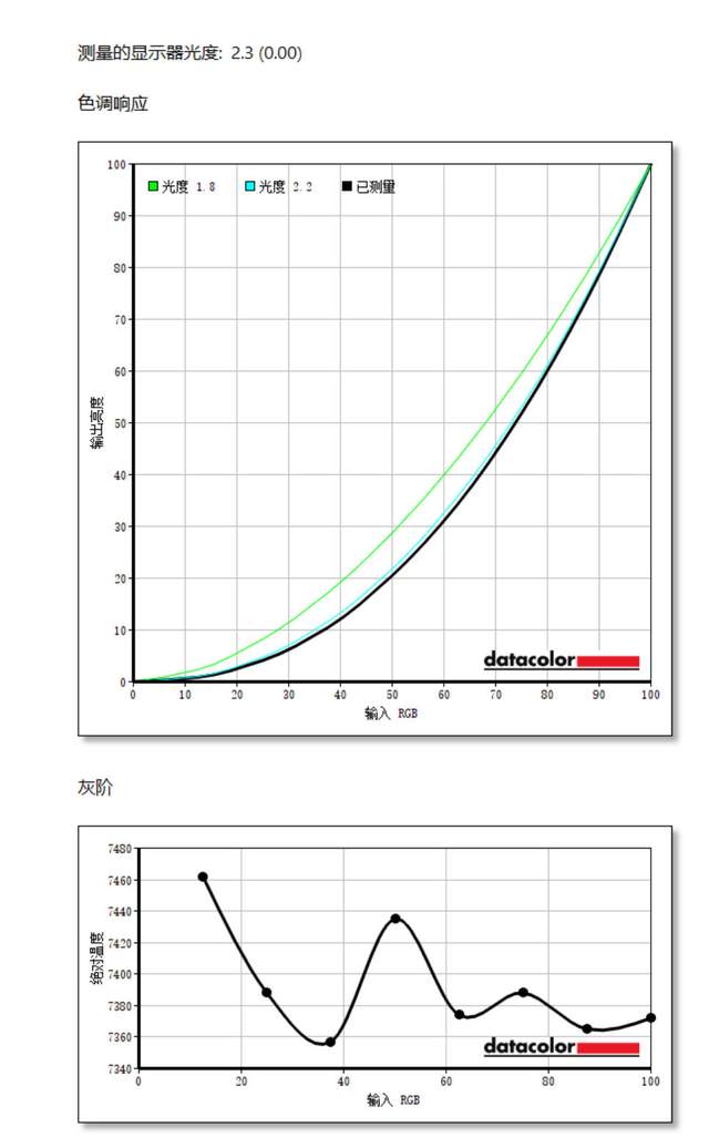 光度曲线部分实测为2.3,20%~100%灰阶色温在7360K~7440K之间,相比标准的6500K要稍微偏冷一些。