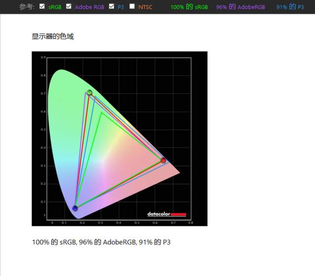 最低亮度下色域会轻微收缩,实测色域覆盖100%sRGB、96%AdobeRGB、91% DCI-P3,和100%亮度其实差别不大。