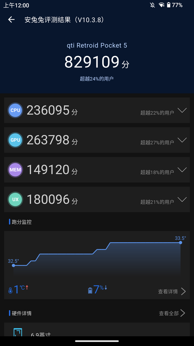 性能与游戏实测理论性能跑分就跑一下娱乐兔了,安兔兔 V10.3.8 版本综合跑分82.91W 分,搭载主动散热的情况下一次跑分后温度上升仅1度。