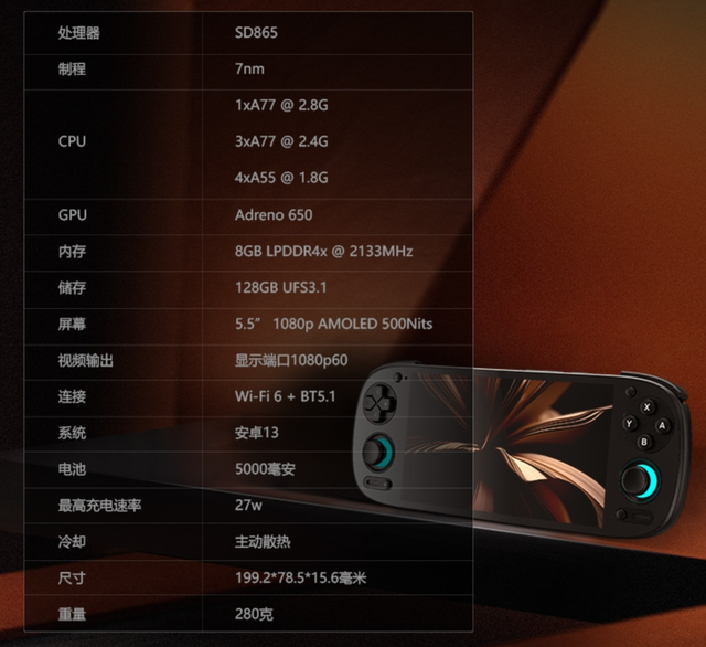 配置参数与对比 RP4P 的升级作为 RP 掌机数字系列的第5代,RP5 和前段时间已经发货的 RP mini(Retroid Pocket mini),都采用了来自高通的骁龙865 SOC,4核心 A77+4核心 A55 CPU + Adreno650 GPU。虽然以手机的眼光看,骁龙865已经是老老老老老款旗舰 SOC,但在复古掌机领域骁龙865依旧是性能很不错的 SOC,也能满足除了 NS 以外各种复古模拟器对性能的需求。(其实骁龙865也可以玩不少的 NS 游戏,但考虑到目前 Yuzu 已经没有维护和更新,如果要完美更换更强的 SOC 也依旧做不到,作为当前时代的机器,对 NS 有需求的用户还是直接买 NS 吧) 除了 SOC 以外,RP5 的主要参数如下: - 5.5英寸 1920x1080 16:9 60Hz OLED 屏幕