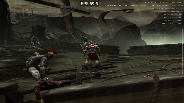 游戏部分在骁龙865上测试老平台没有意义(肯定满帧),由于到手时间还比较短,就简单测试了 PS2、3DS、WiiU(CEMU)、NS(Yuzu)。 首先是 PS2 上的经典测试游戏战神,性能模式、风扇智能、游戏 2.5X 分辨率、Vulkan API、EE 0/0,基本是轻松满帧的。