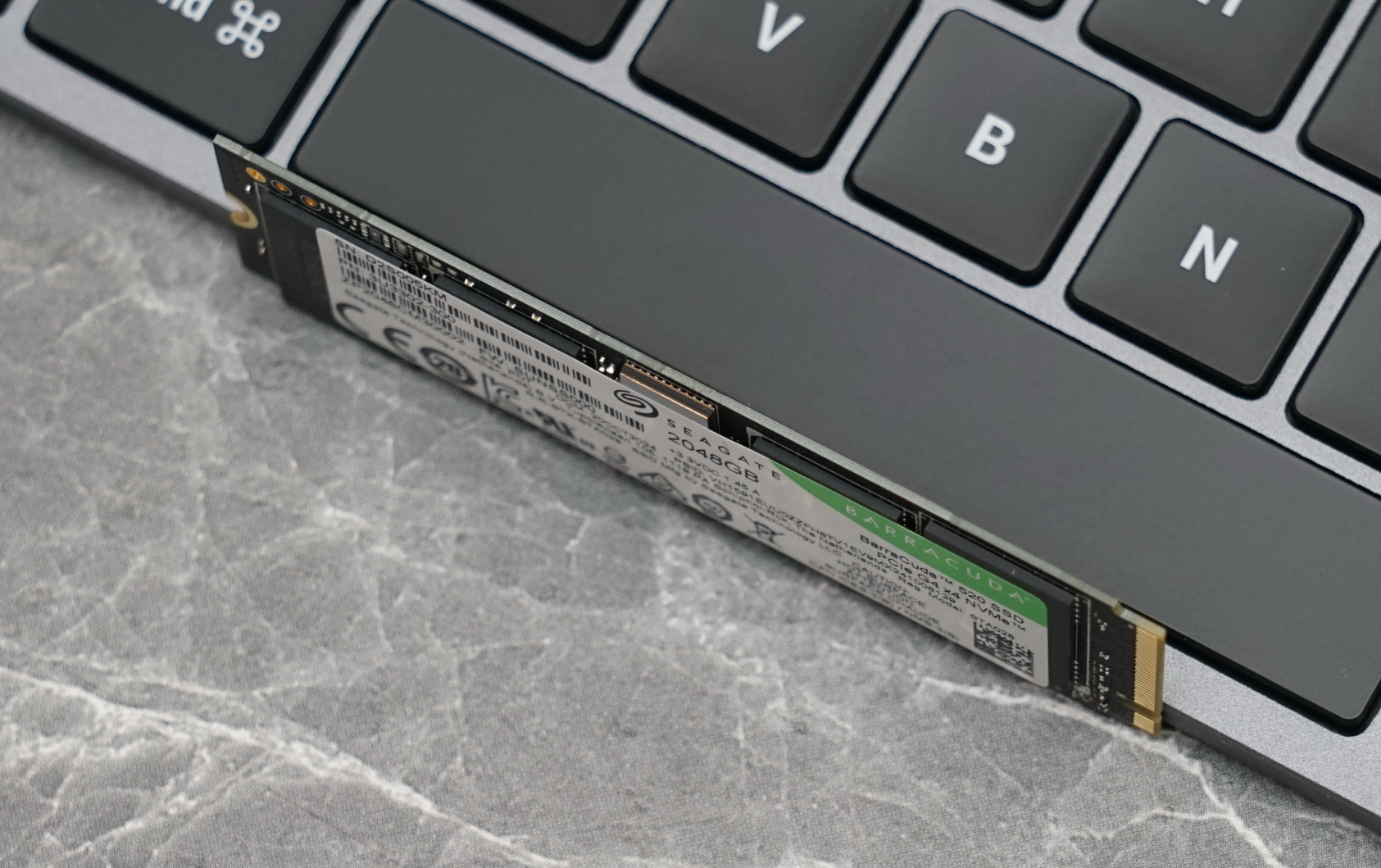 希捷酷鱼530正面覆盖有标签贴纸,上面标有SSD的序列号和容量等信息。这贴纸也具有导热效果,日常使用时大家最好别自己随便撕下来,免得影响散热和保修。