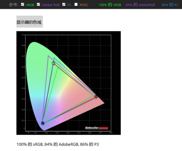 色域部分实测覆盖100%sRGB 色域、86%的 P3 色域以及84%的 AdobeRGB 色域,半只脚已经跨入广色域屏幕的行列了。