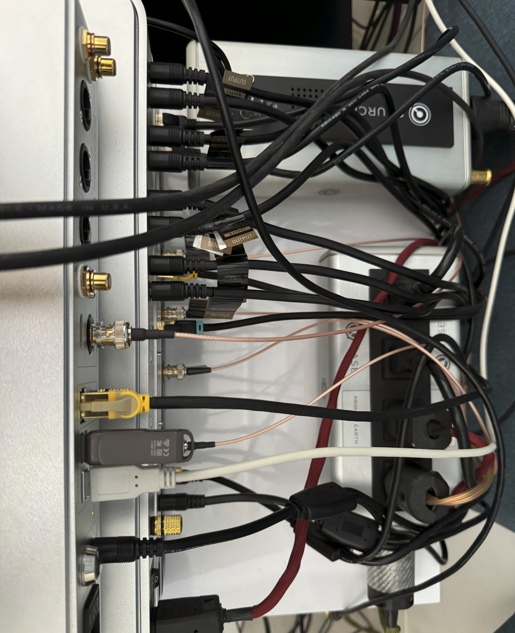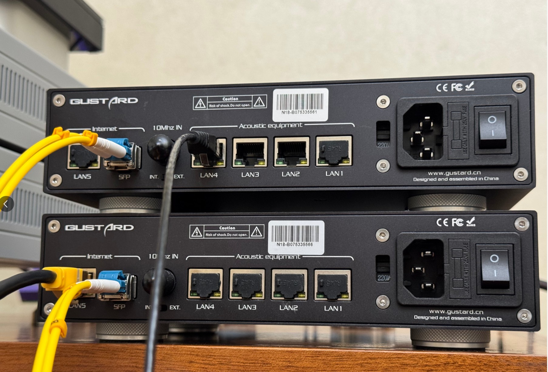所以最早是问歌诗德老黄,借来两台N18 Pro HiFi交换机,这玩意儿基本就是HiFi交换机的最终形态,带SFP光模块,内部全线电供电,体积合适,厚屏蔽,接口多,功能全,还支持时钟加持。 但光隔离的话,是需要用两台。 连接路径:华硕路由器——超八类网线——N18 Pro——SFP双模光线(N18 Pro附带)——N18 Pro——超八类网线——数播。这样。 看着复杂,其实很简单。测试期间,一堆数播、流媒体解码器啥的换着玩。
